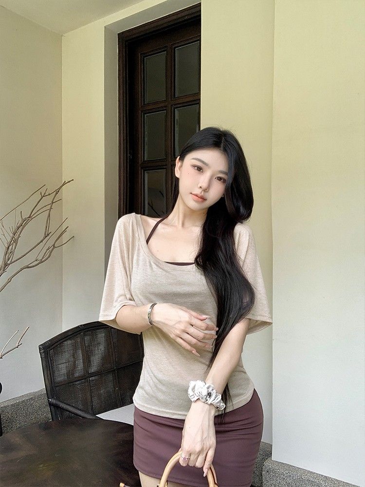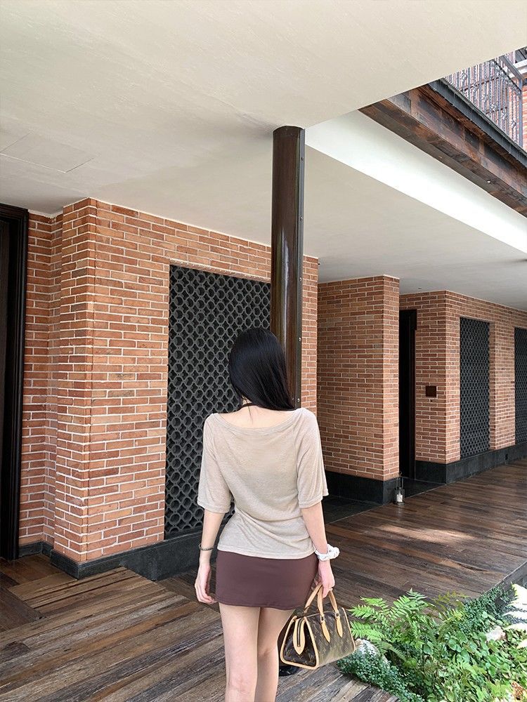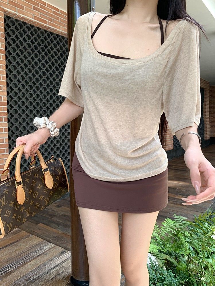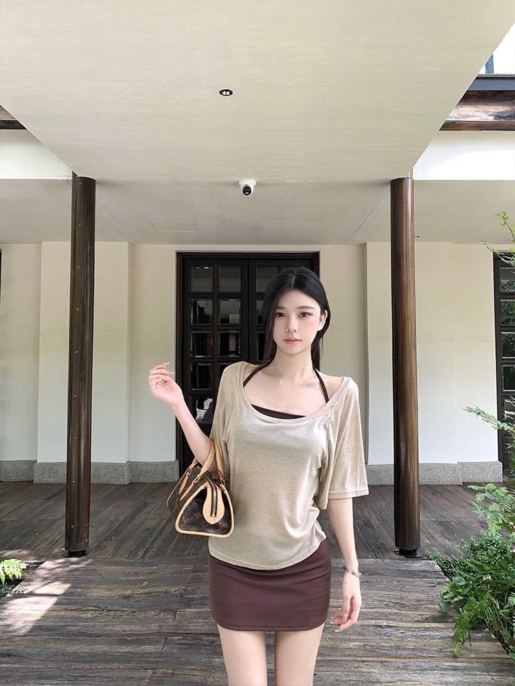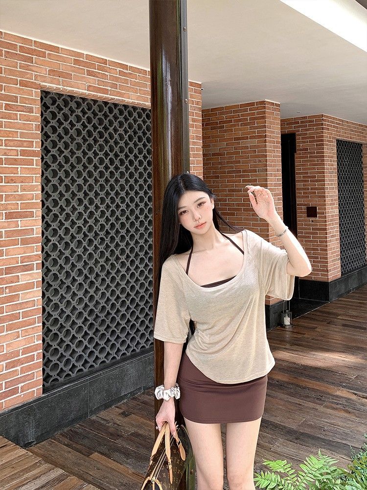 아메리칸 핫걸 스타일 얇은 라지 칼라 미드슬리브 블라우스 여성용 솔리드 컬러 홀터넥 조끼 스커트 3피스 세트스토어 가기