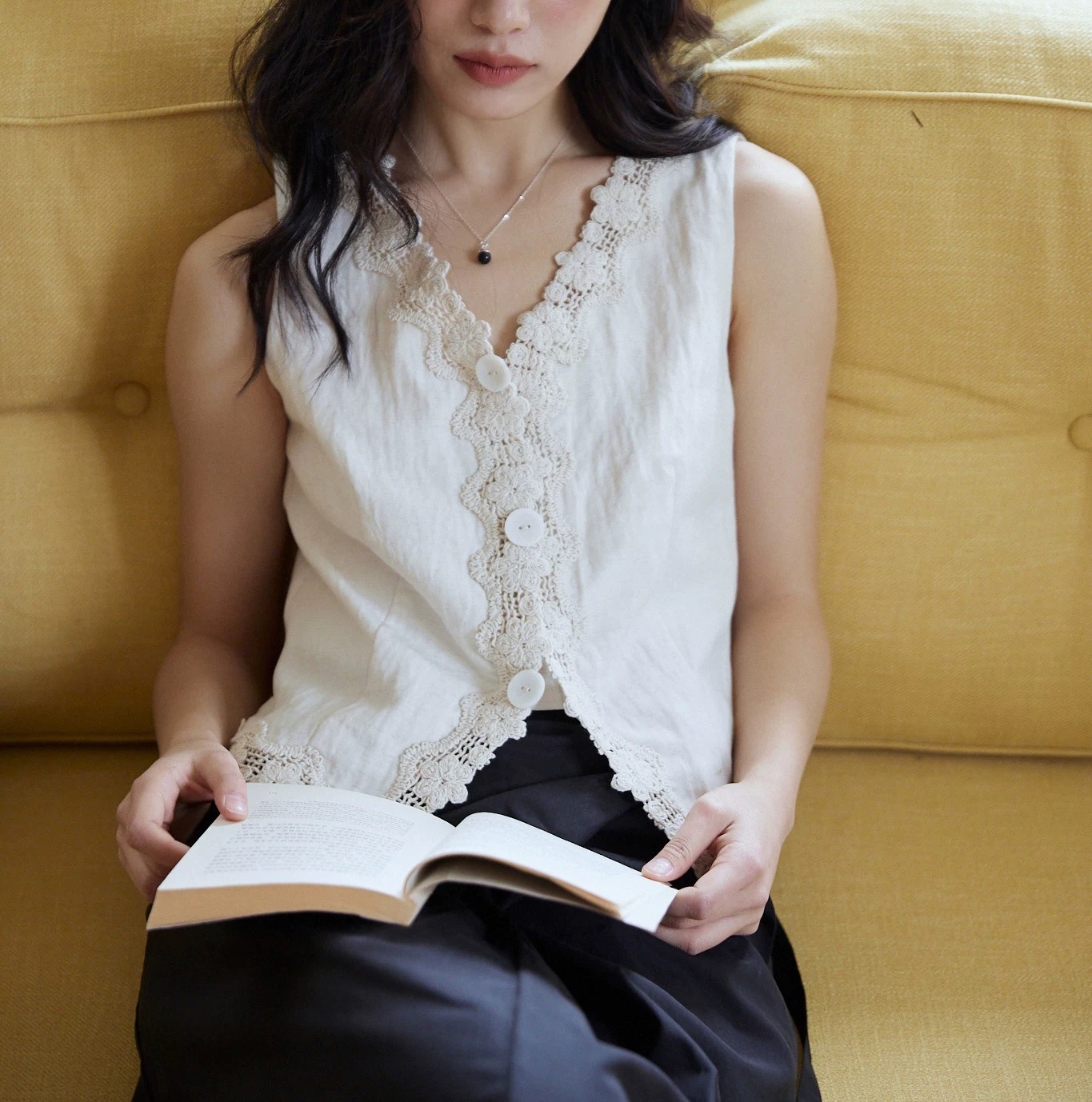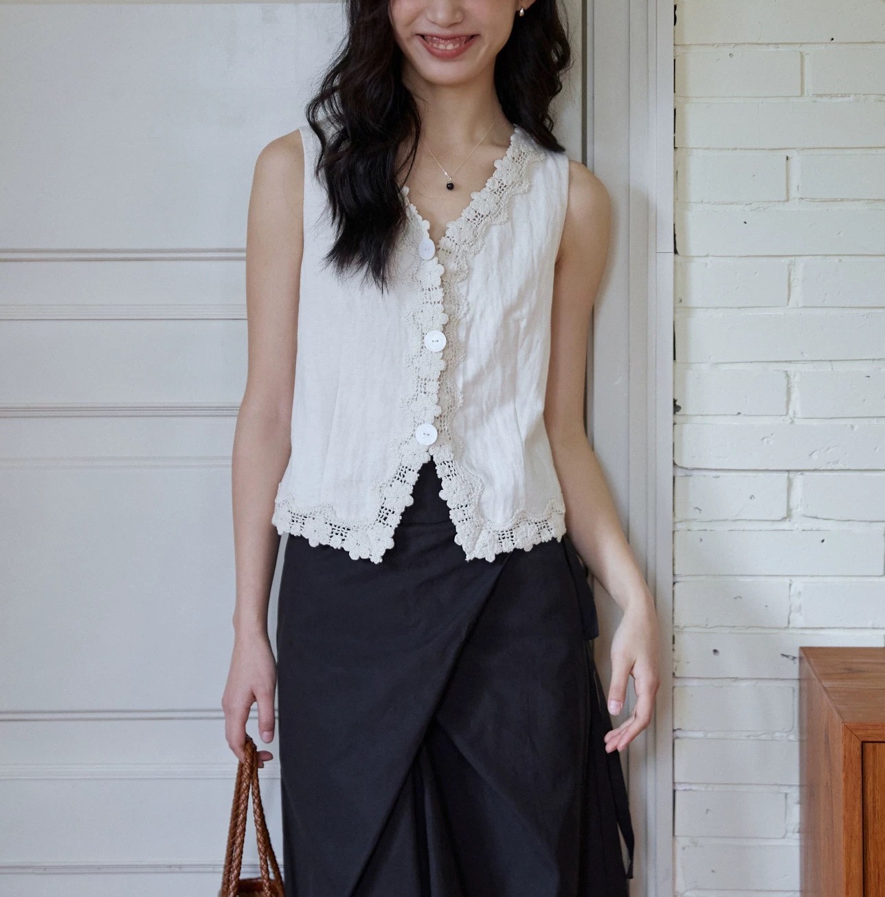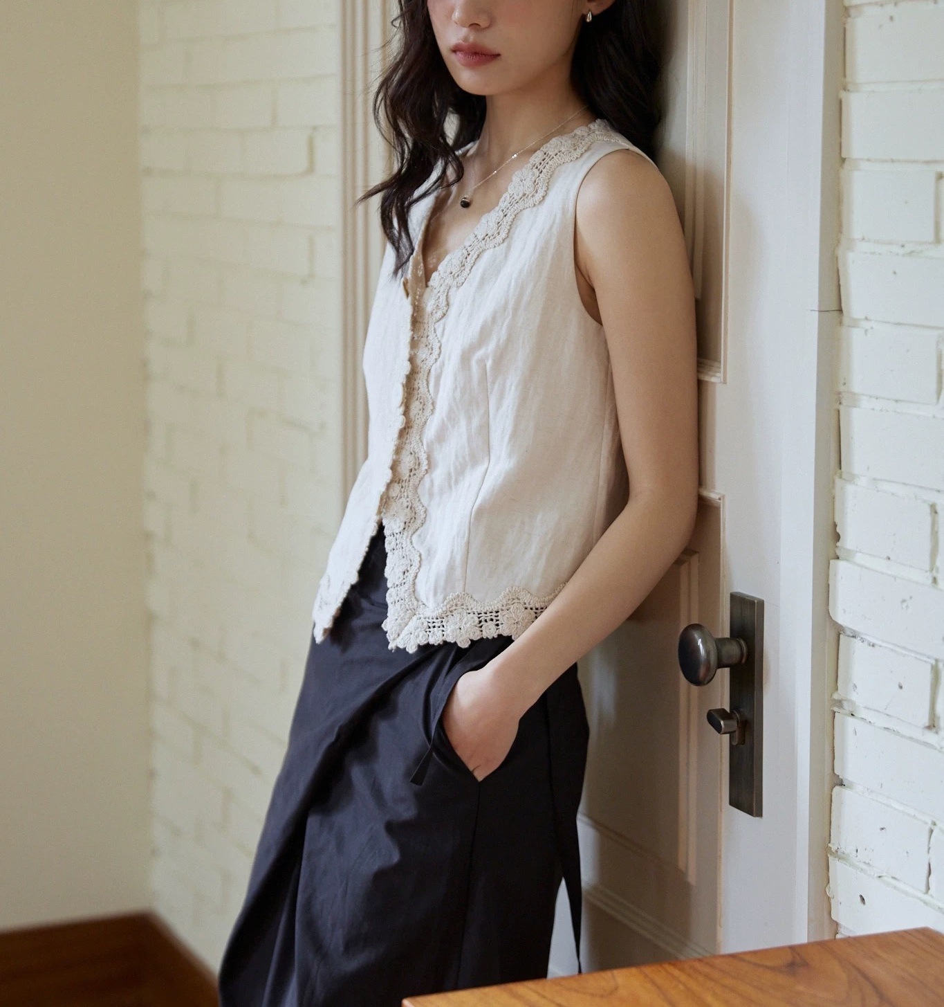 MIXBAO 프렌치 살구 레이스 v 넥 조끼 여성 여름 디자인 조끼 민소매 주름 질감 탑스토어 가기