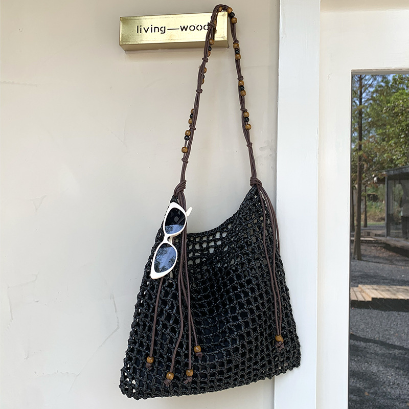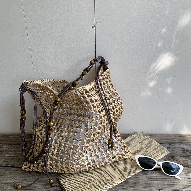비즈 레트로 겨드랑이 가방 대용량 숄더 토트 백 해변 휴가 짠 가방 게으른 스타일 밀짚 가방