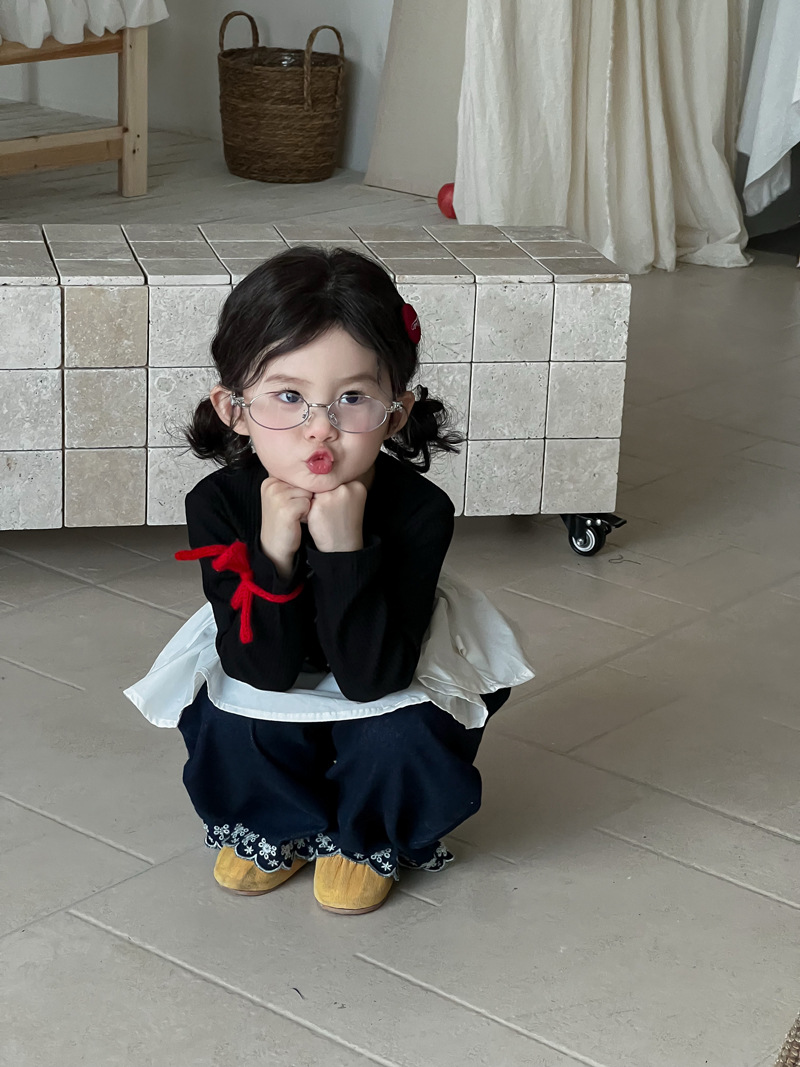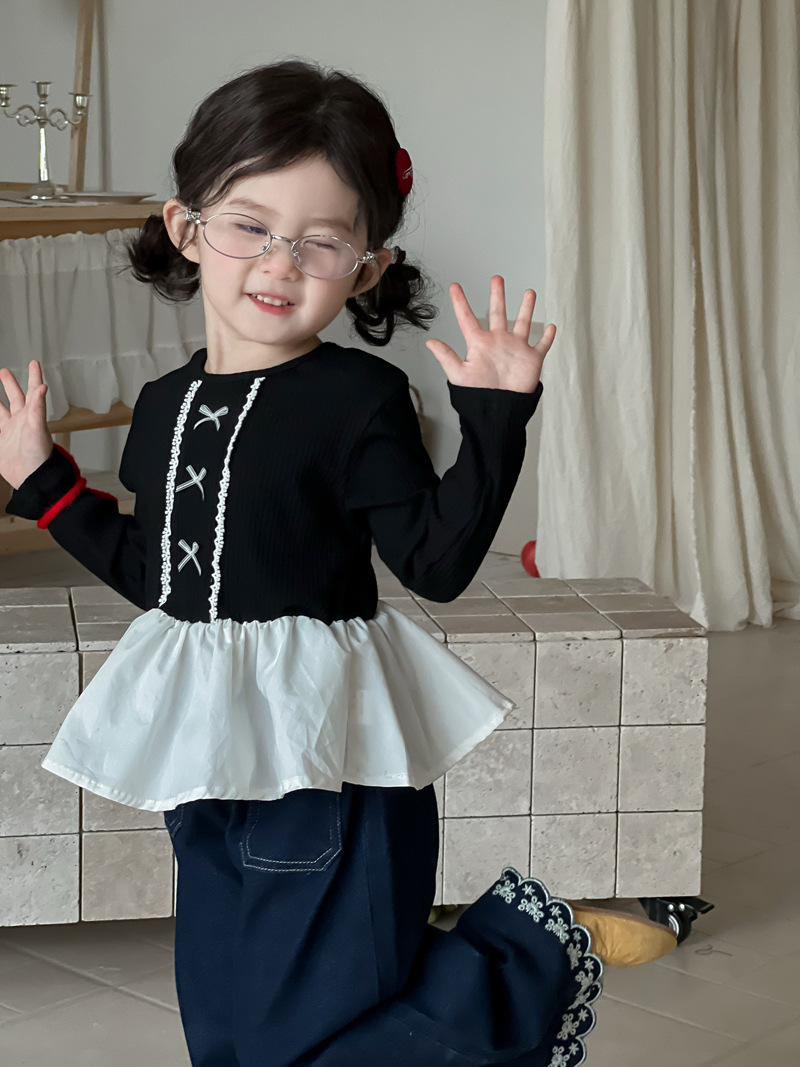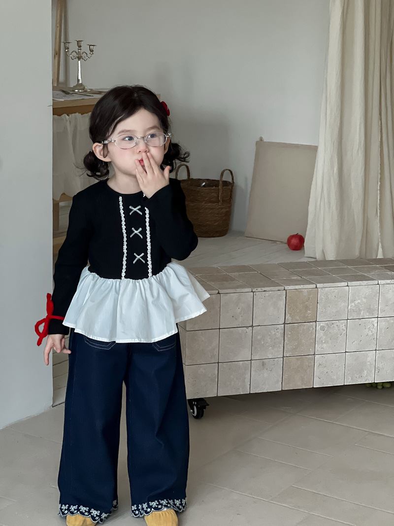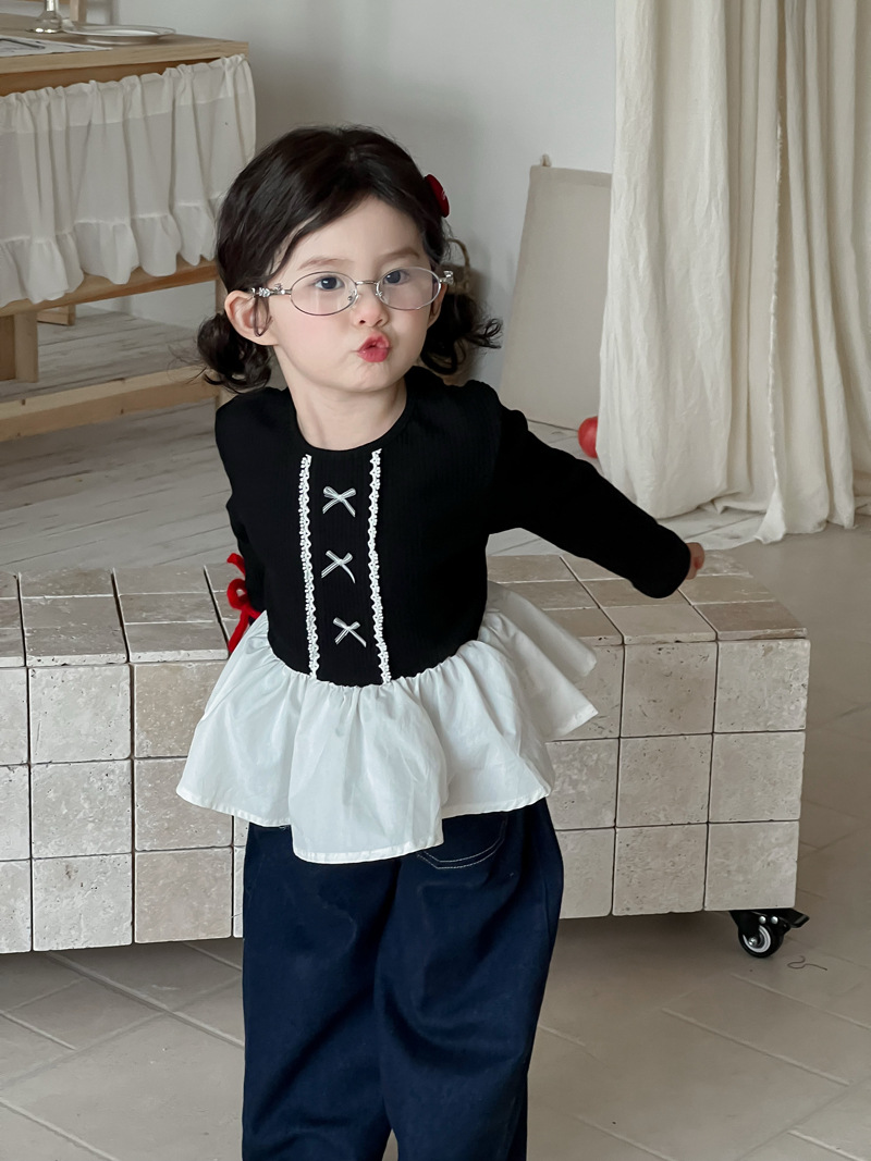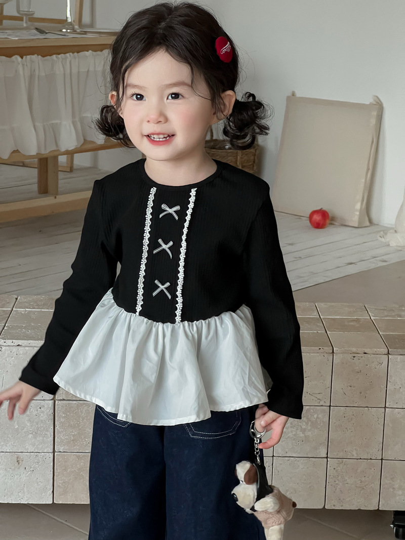 Wheatfield 시즌 가을, 겨울 새로운 아동 의류 한국 스타일 소녀 프릴 공주 바닥 셔츠 아동 보우 레이스 탑