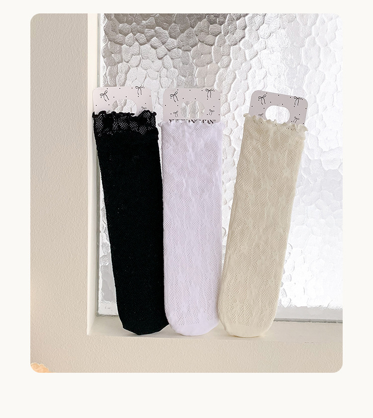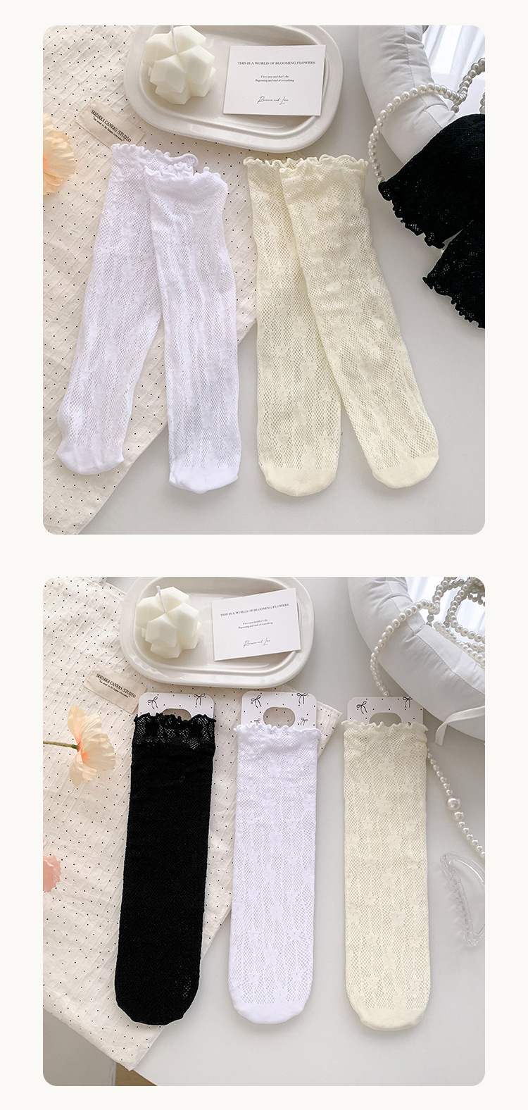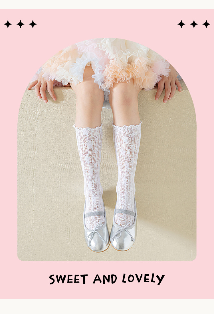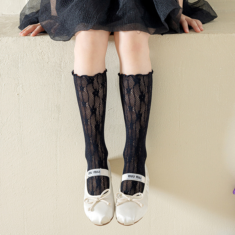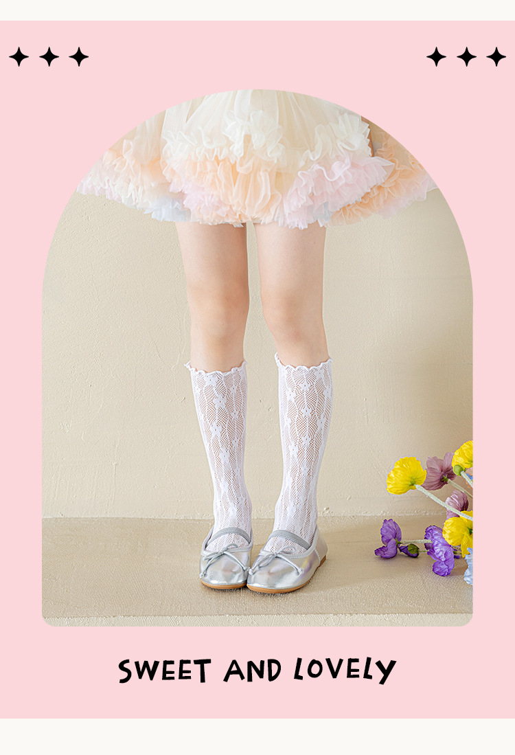 Misscucudog 어린이 봄 여름 얇은 중공 꽃 로리타 흰색 귀 더미 중간 튜브 양말