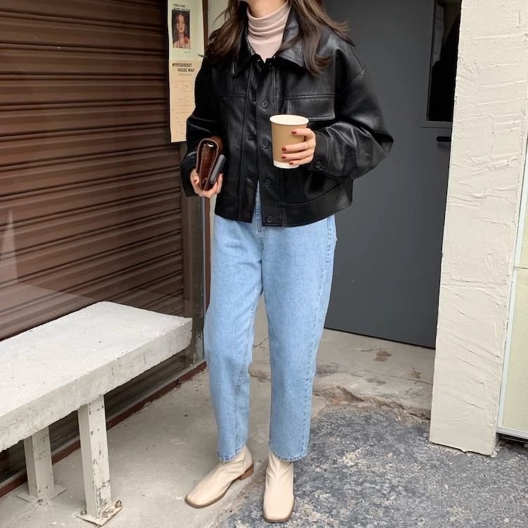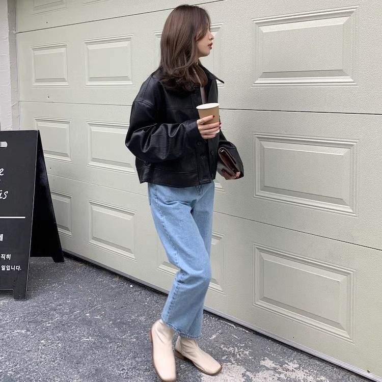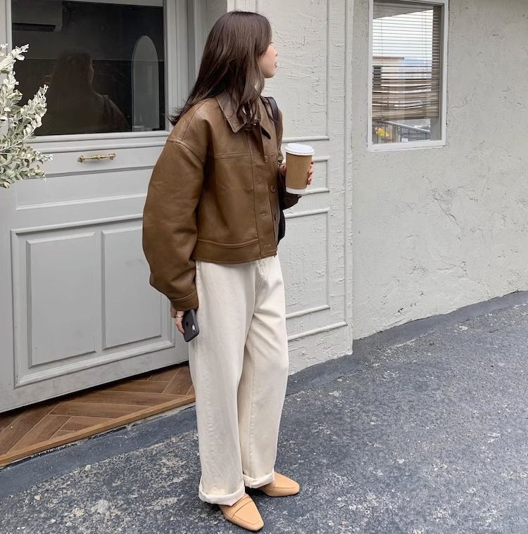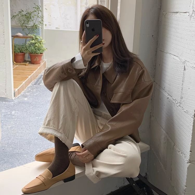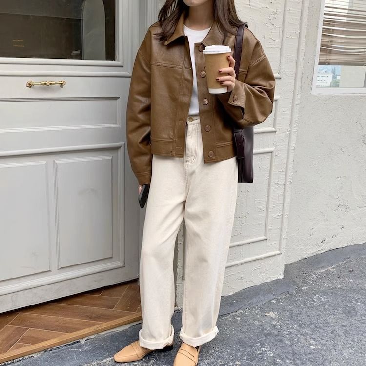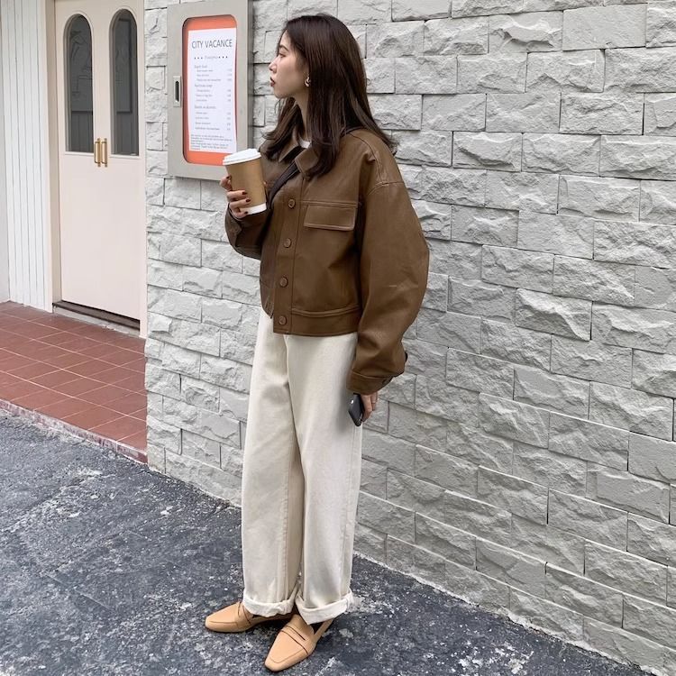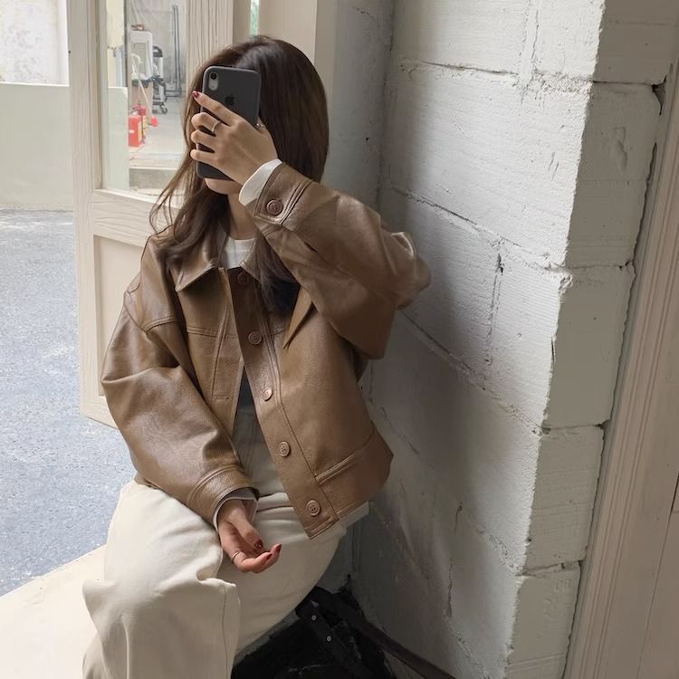 여성을위한 유럽 갈색 가죽 자켓 2025 봄과 가을 새로운 복고풍 인기 pu 가죽 짧은 자켓 작은 사람들을위한스토어 가기