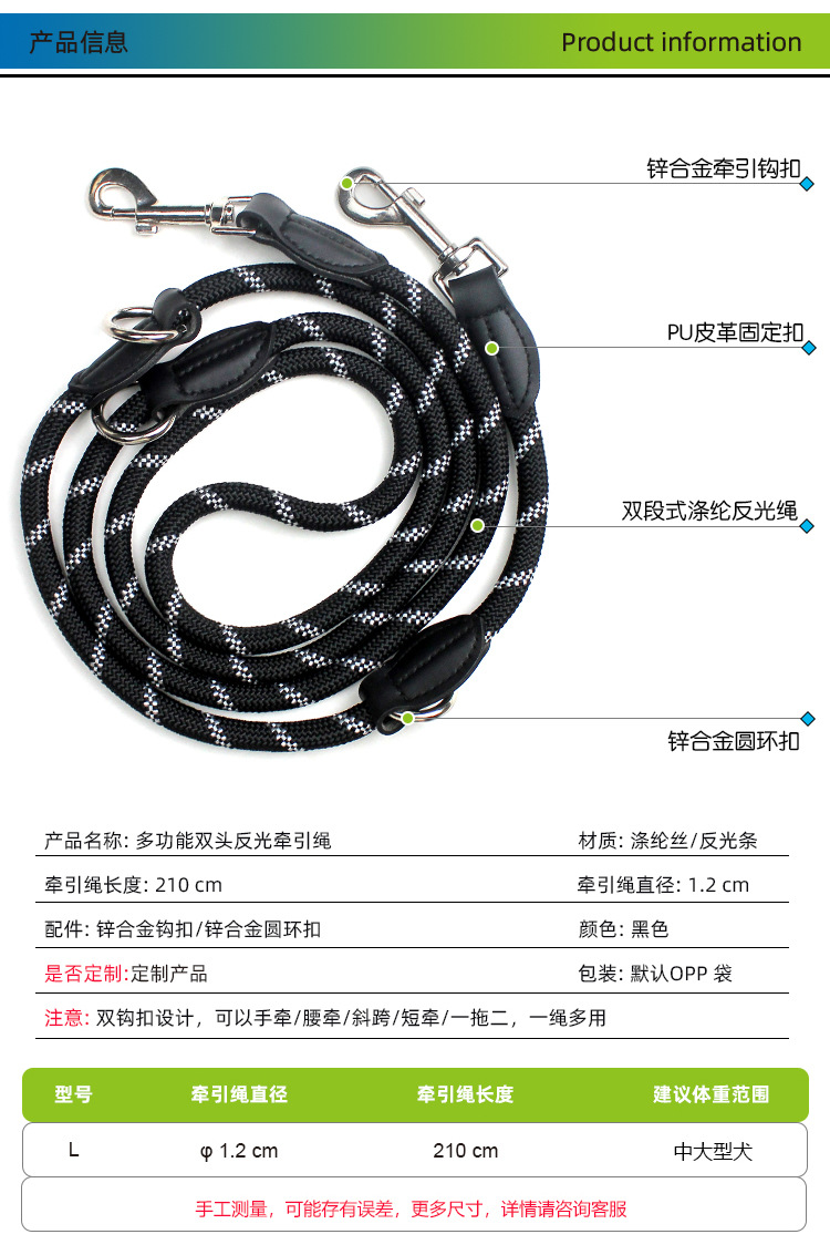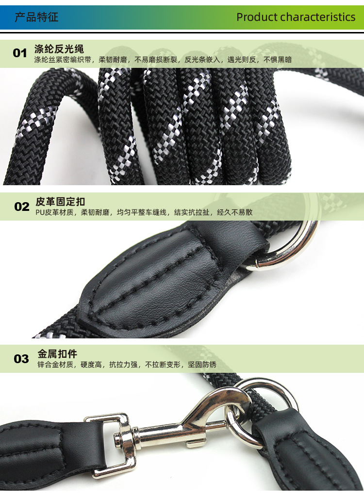 可调节牛皮扣狗狗牵引绳不勒脖涤纶编织反光双头遛狗防爆冲牵引绳