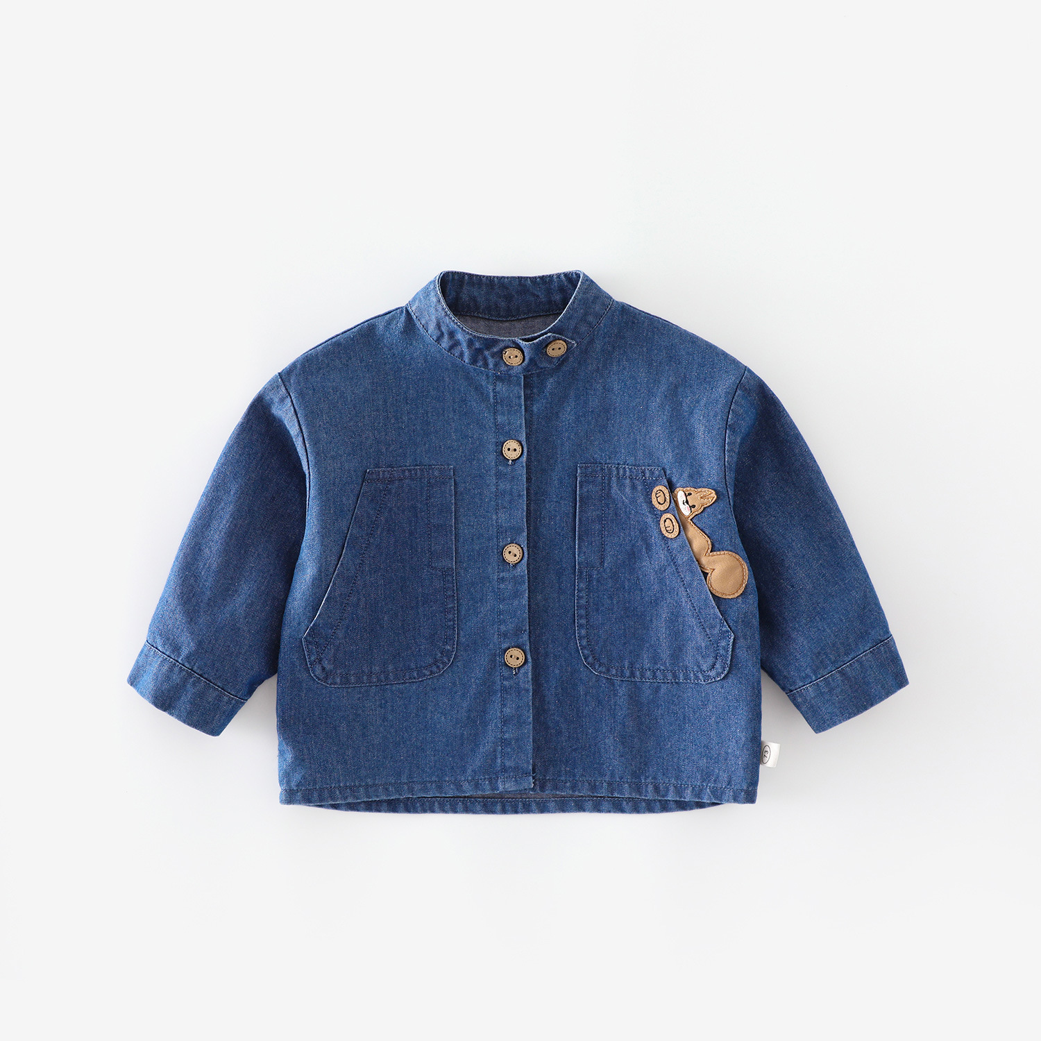어린이 만화 캐릭터 셔츠, 가을 남아용 자수 다람쥐 스탠드 칼라 데님 셔츠, 아기 한국 스타일 가을옷스토어 가기