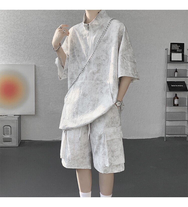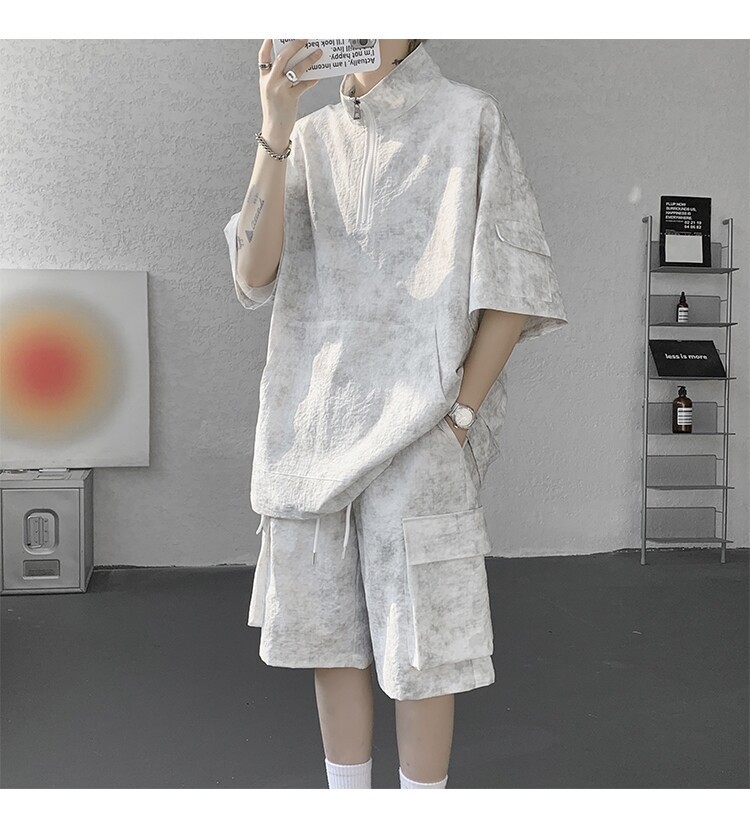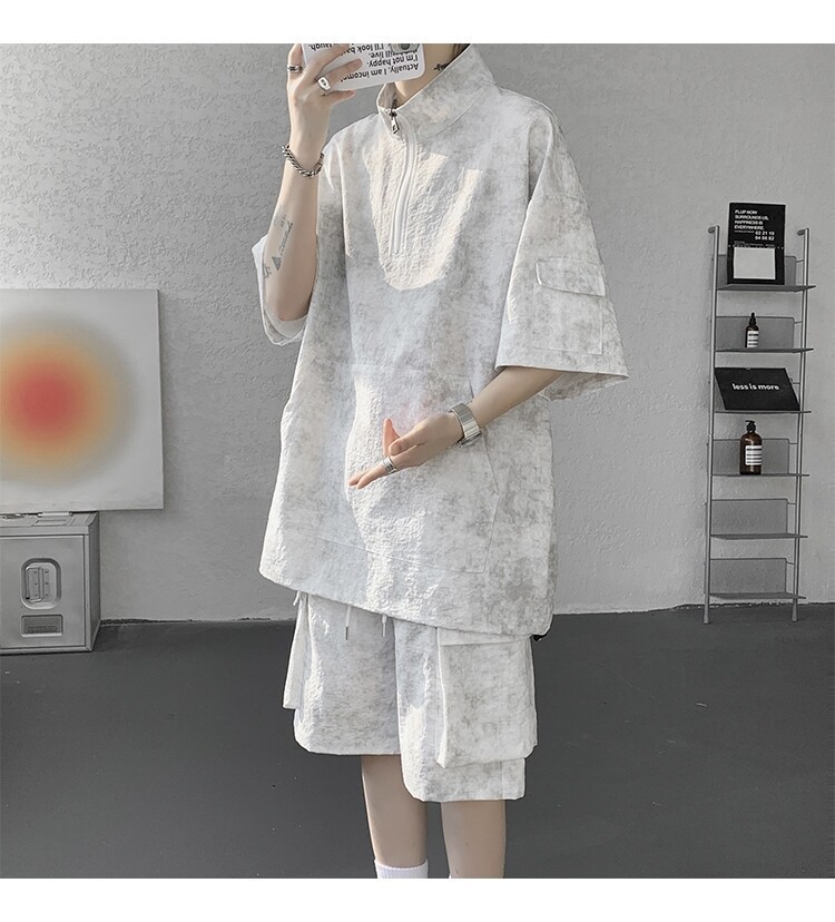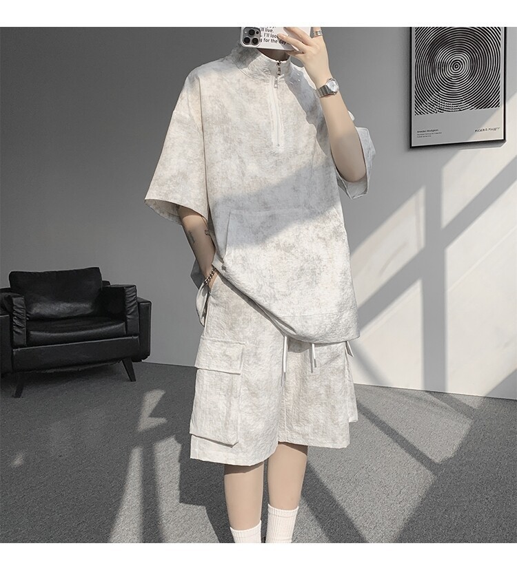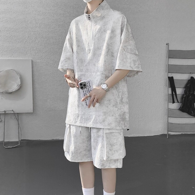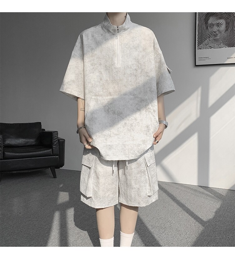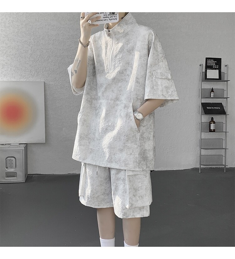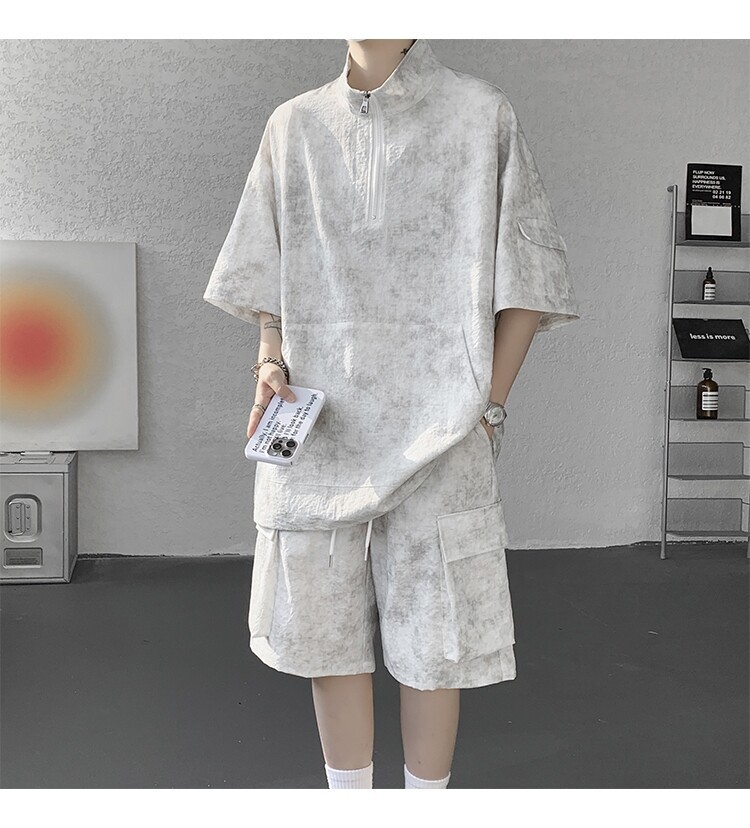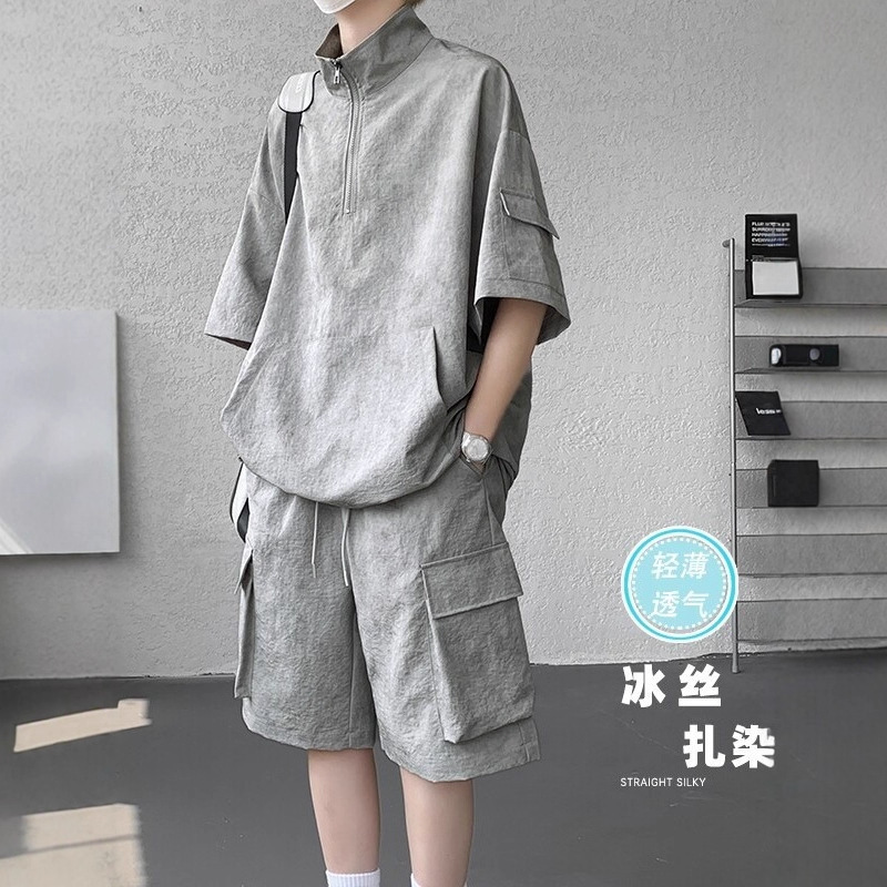 여름 스포츠 정장 남성용 하프 지퍼 타이 염색 아이스 실크 반팔 반바지 청소년 작업복 캐주얼 매칭 투피스 세트