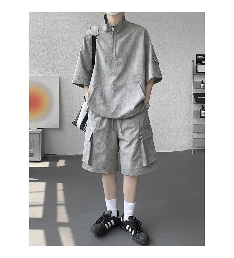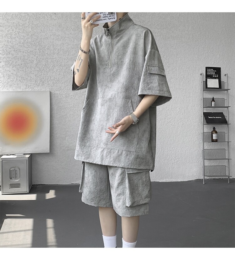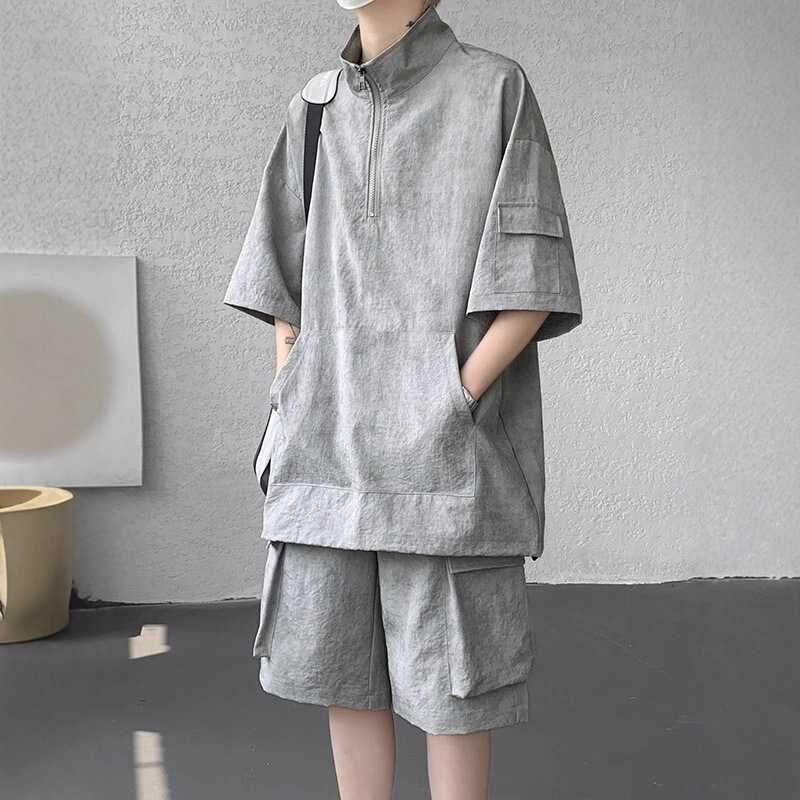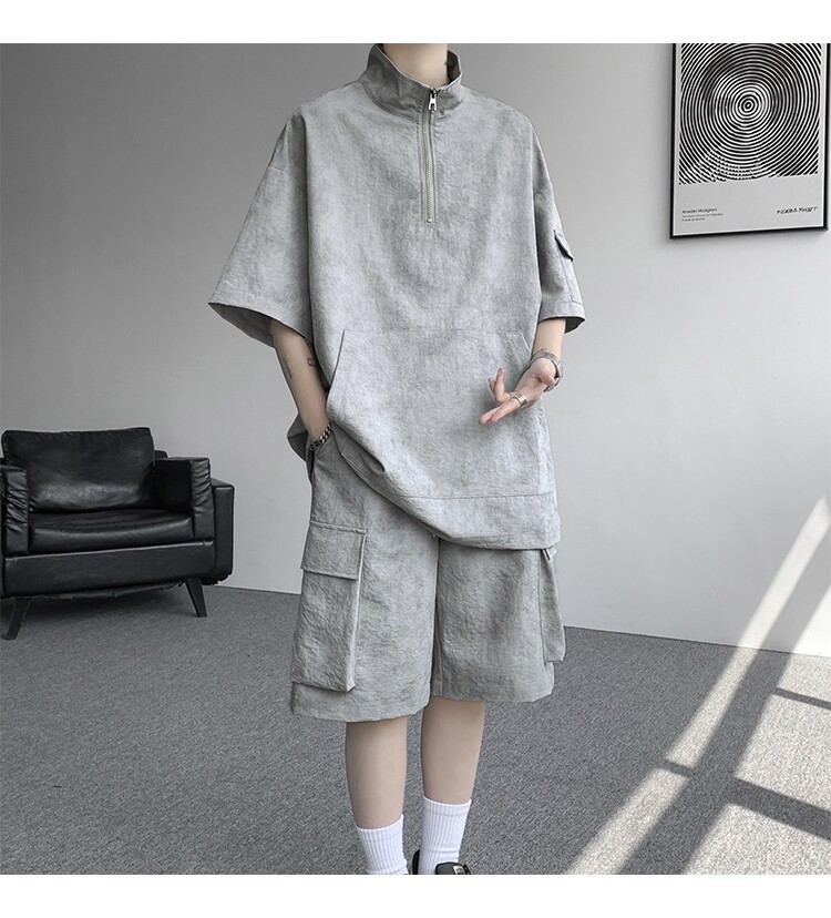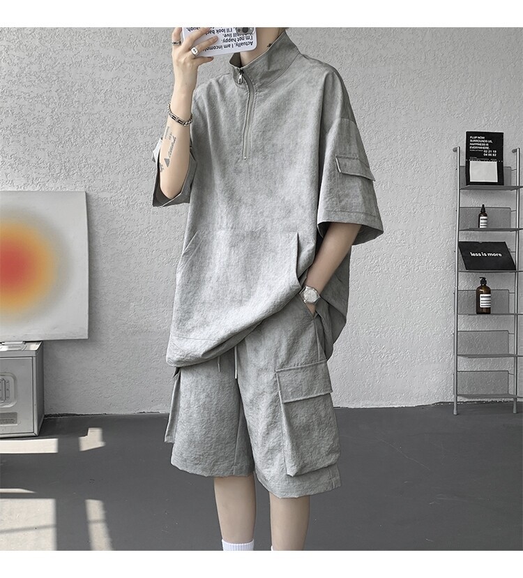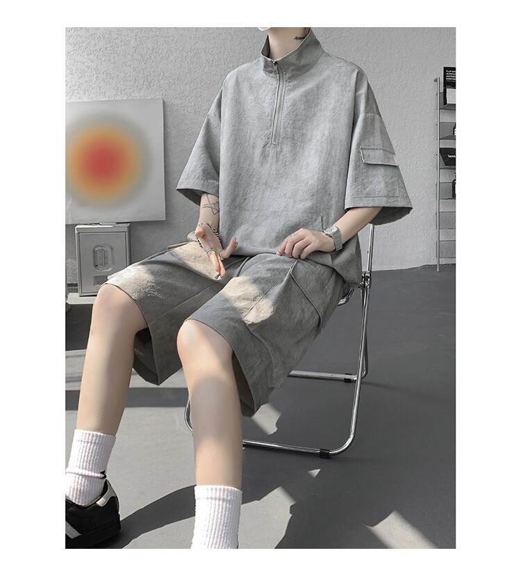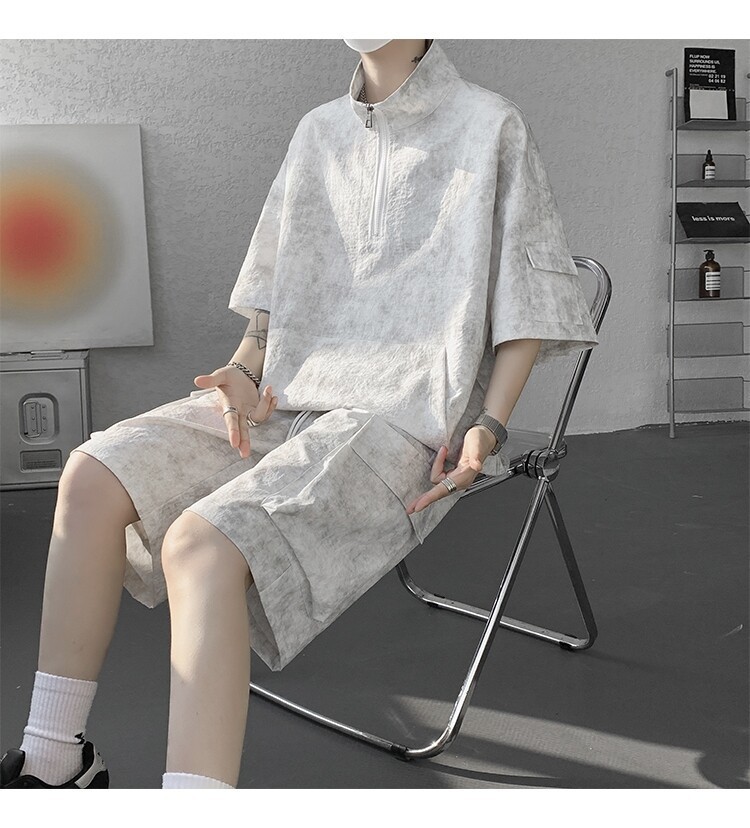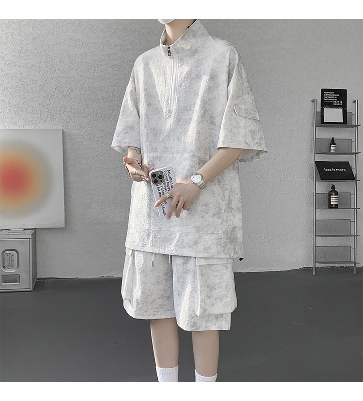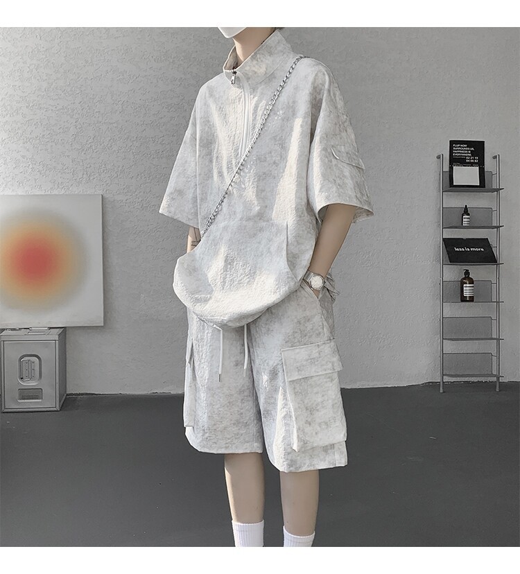 여름 스포츠 정장 남성용 하프 지퍼 타이 염색 아이스 실크 반팔 반바지 청소년 작업복 캐주얼 매칭 투피스 세트