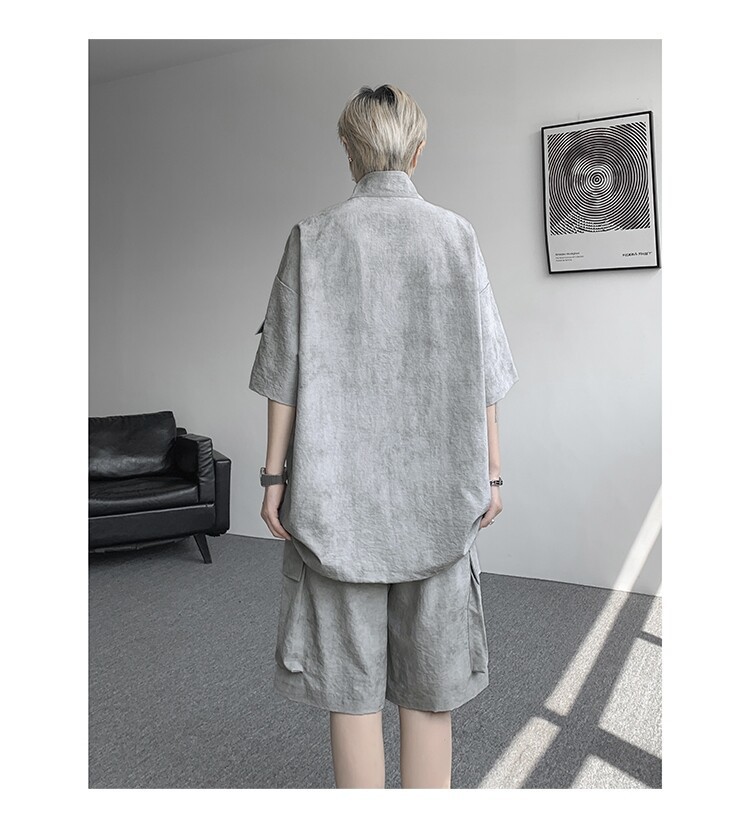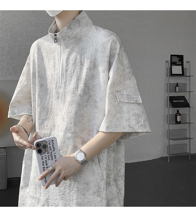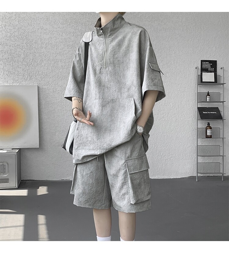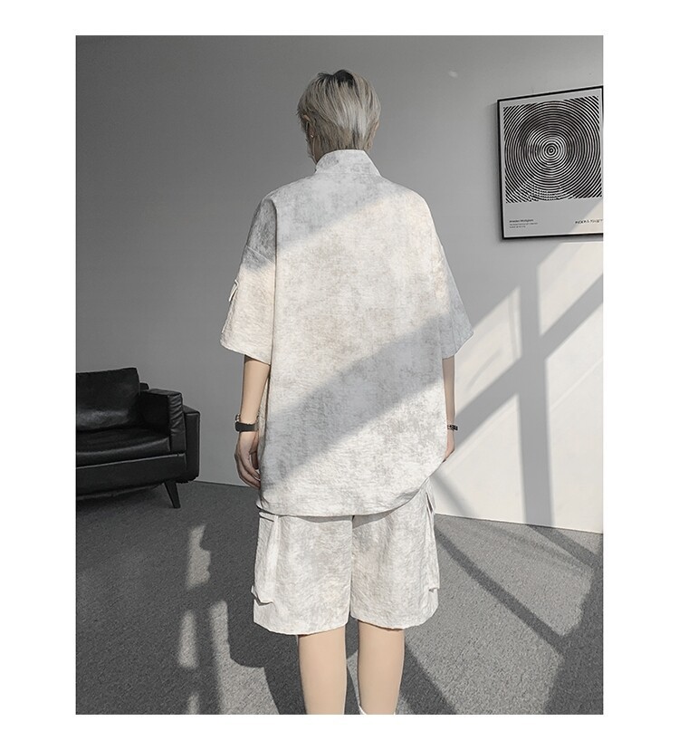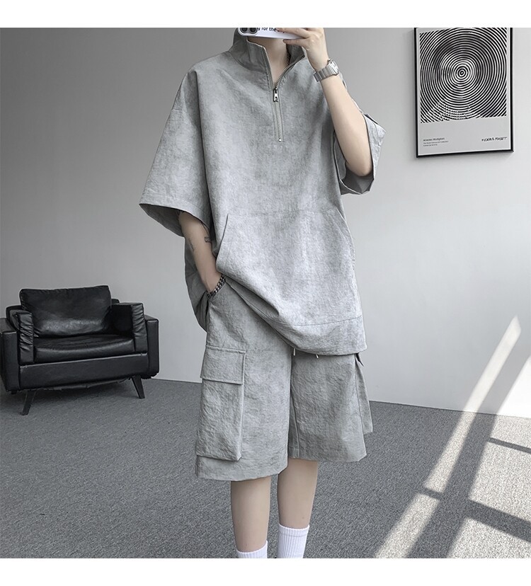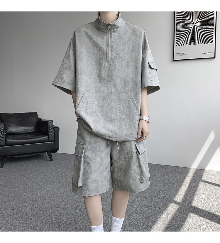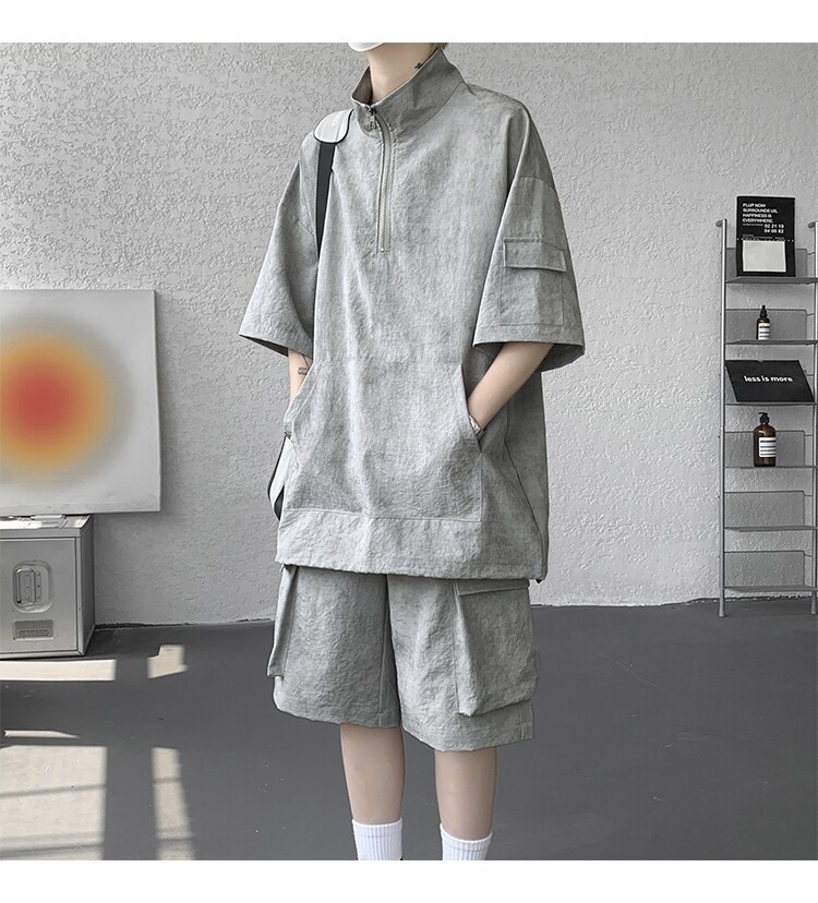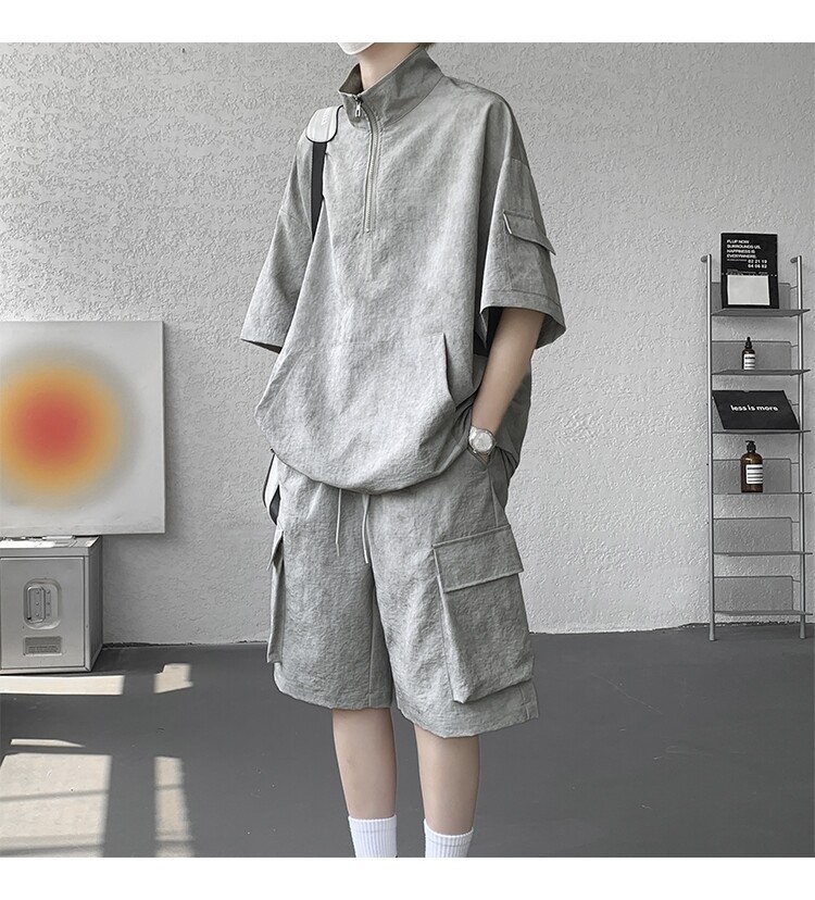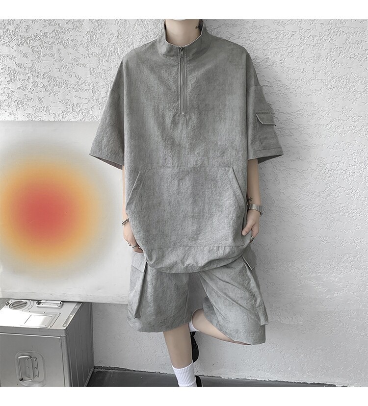 여름 스포츠 정장 남성용 하프 지퍼 타이 염색 아이스 실크 반팔 반바지 청소년 작업복 캐주얼 매칭 투피스 세트