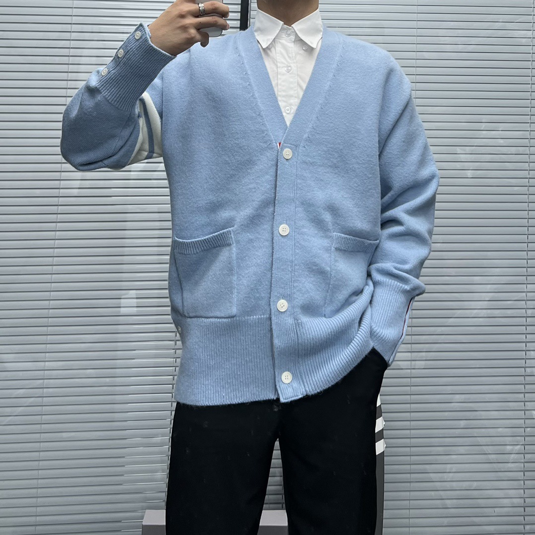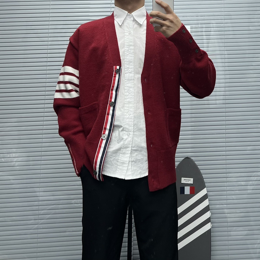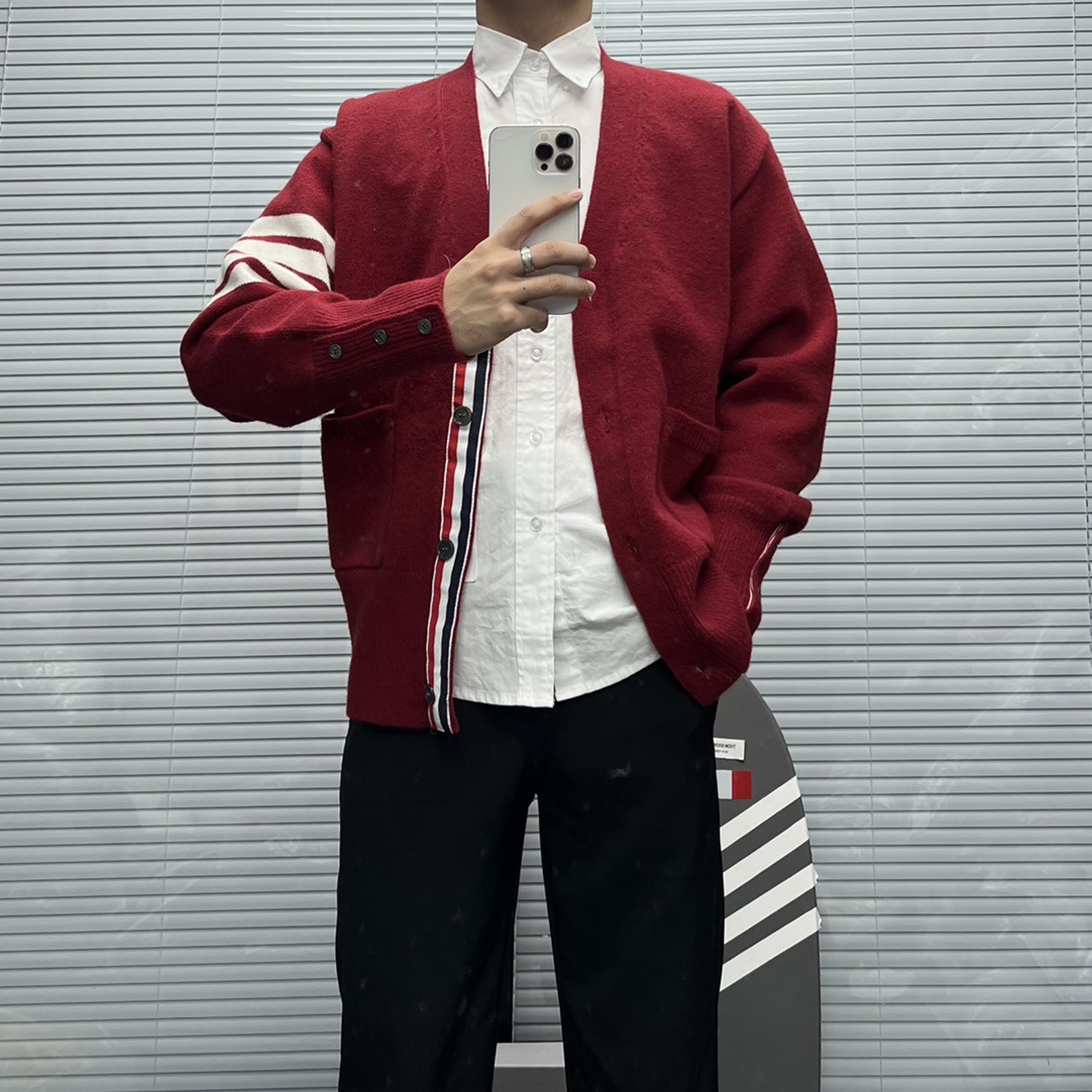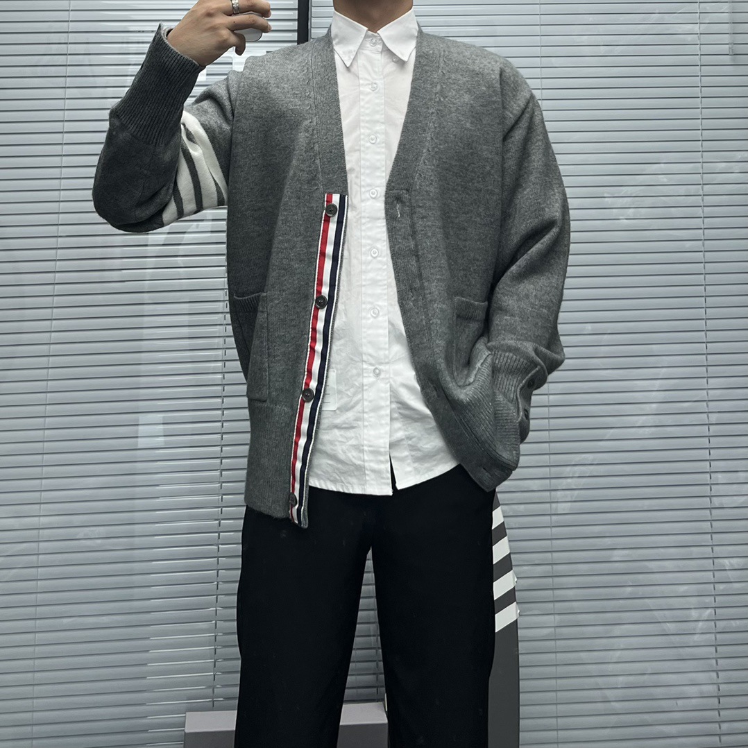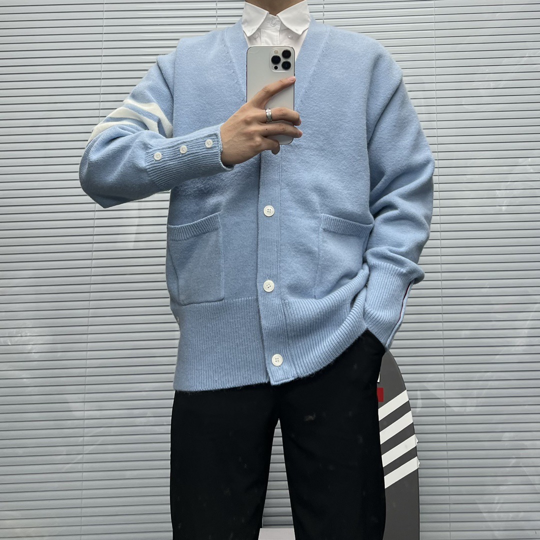 TB 신상 남성용 하이엔드 다용도 4바 스트라이프 니트 루즈 OS 버전 카디건 학습 브이넥 스웨터 재킷스토어 가기