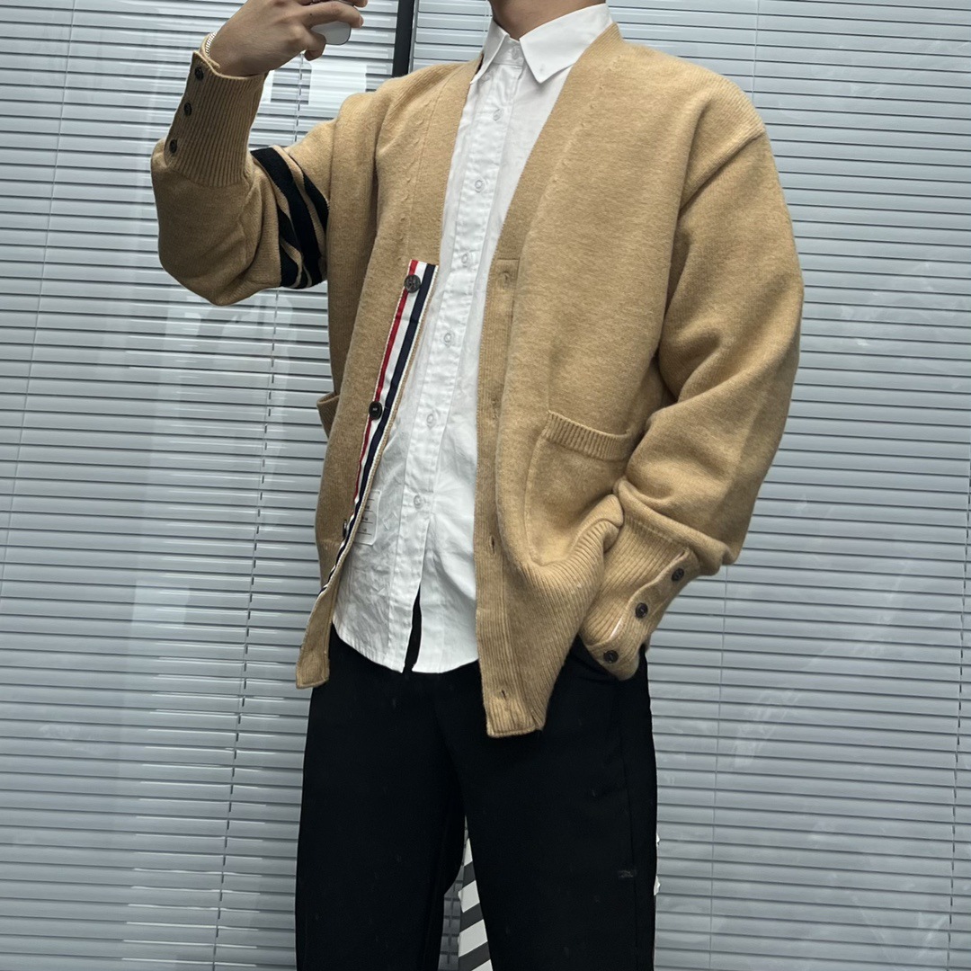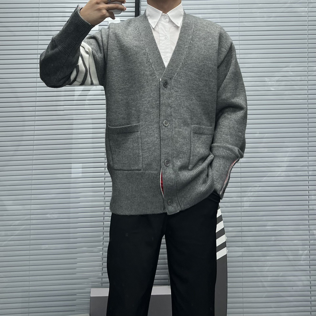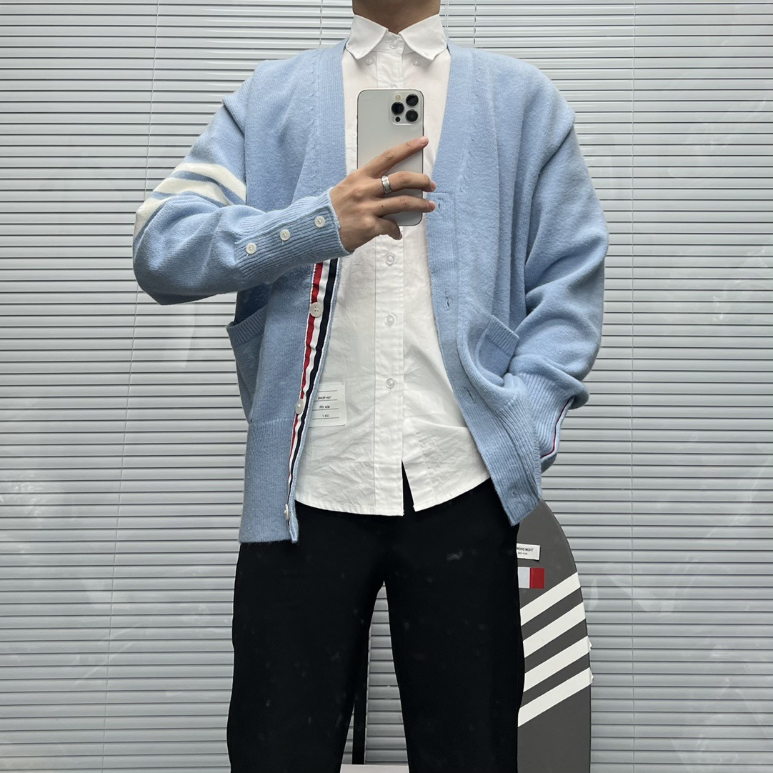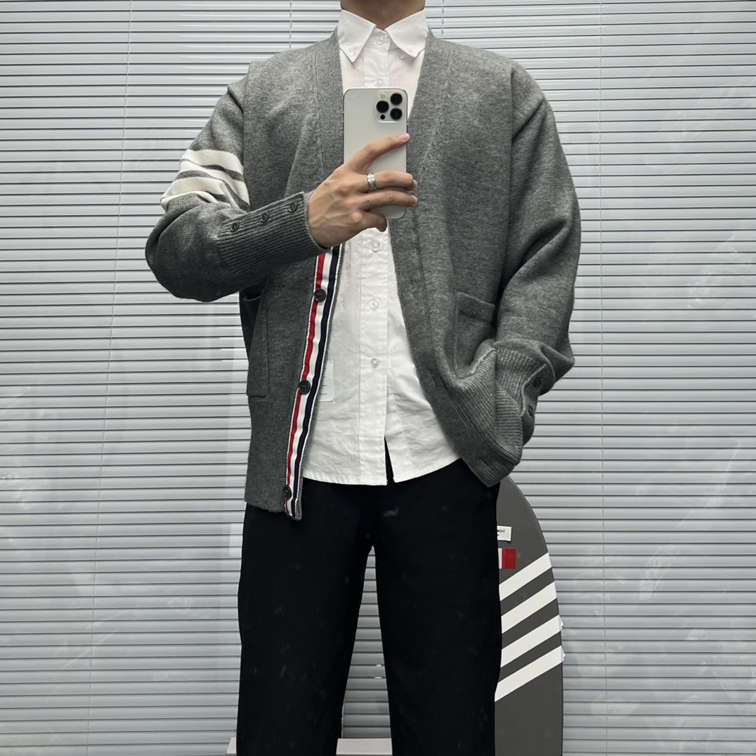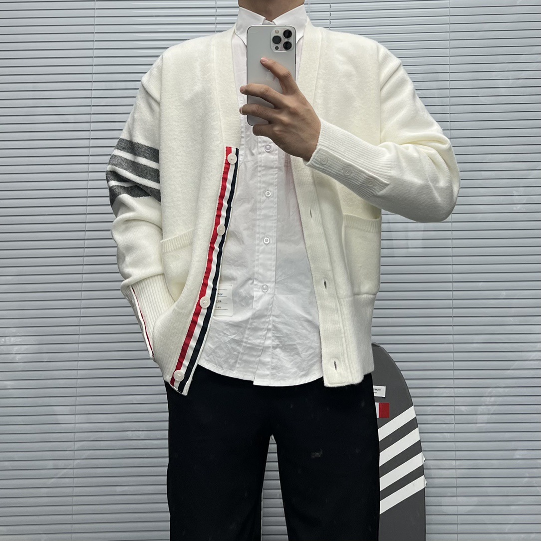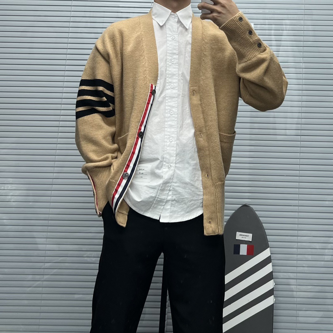 TB 신상 남성용 하이엔드 다용도 4바 스트라이프 니트 루즈 OS 버전 카디건 학습 브이넥 스웨터 재킷스토어 가기