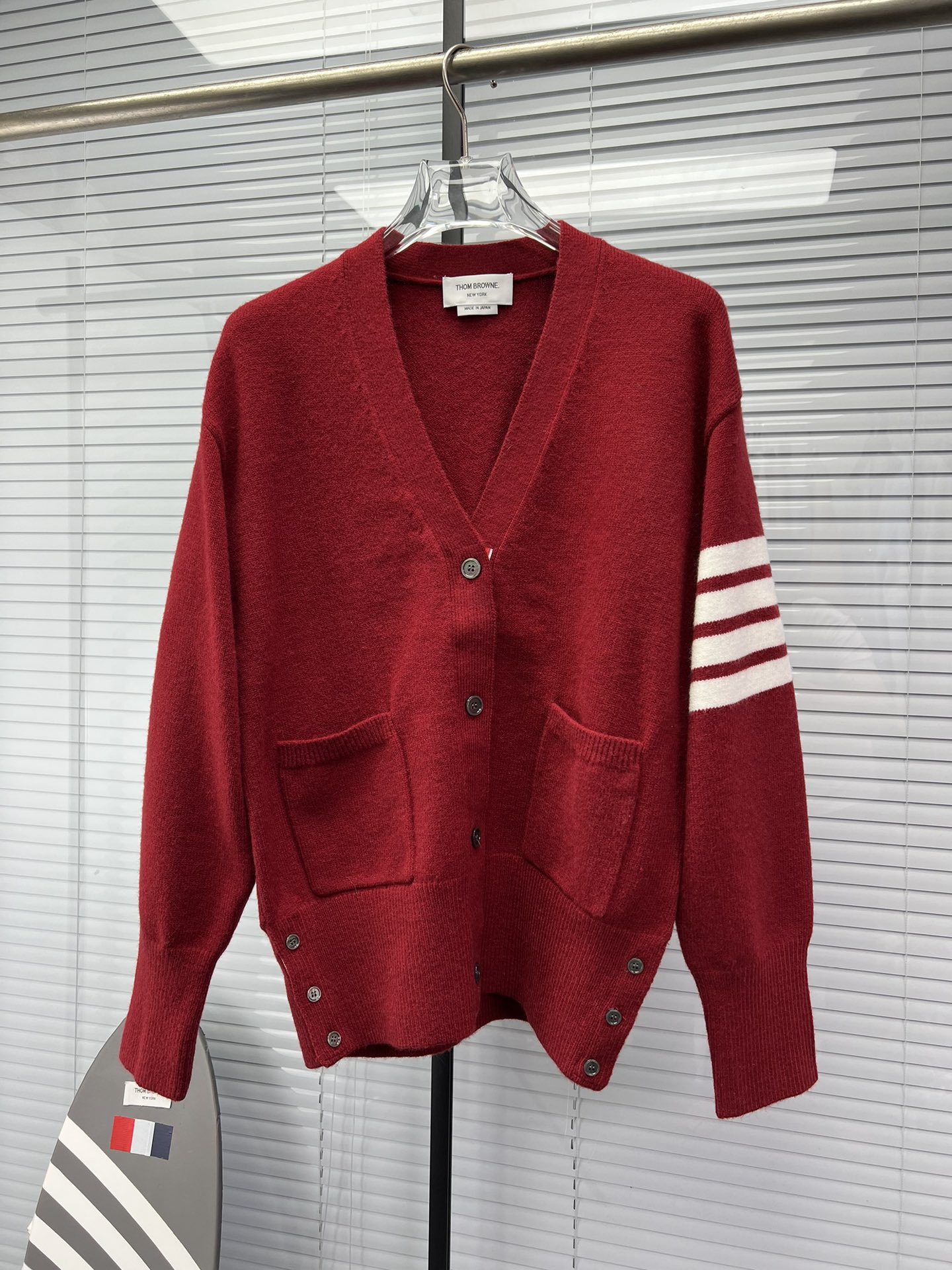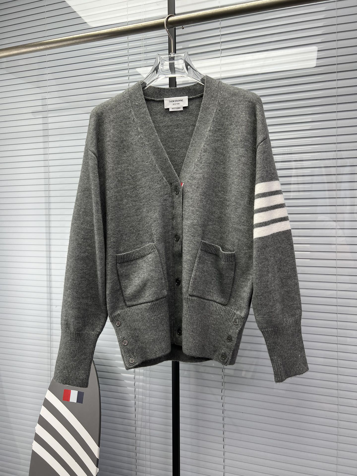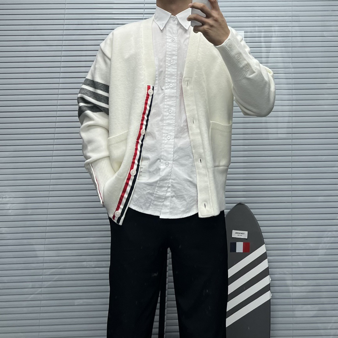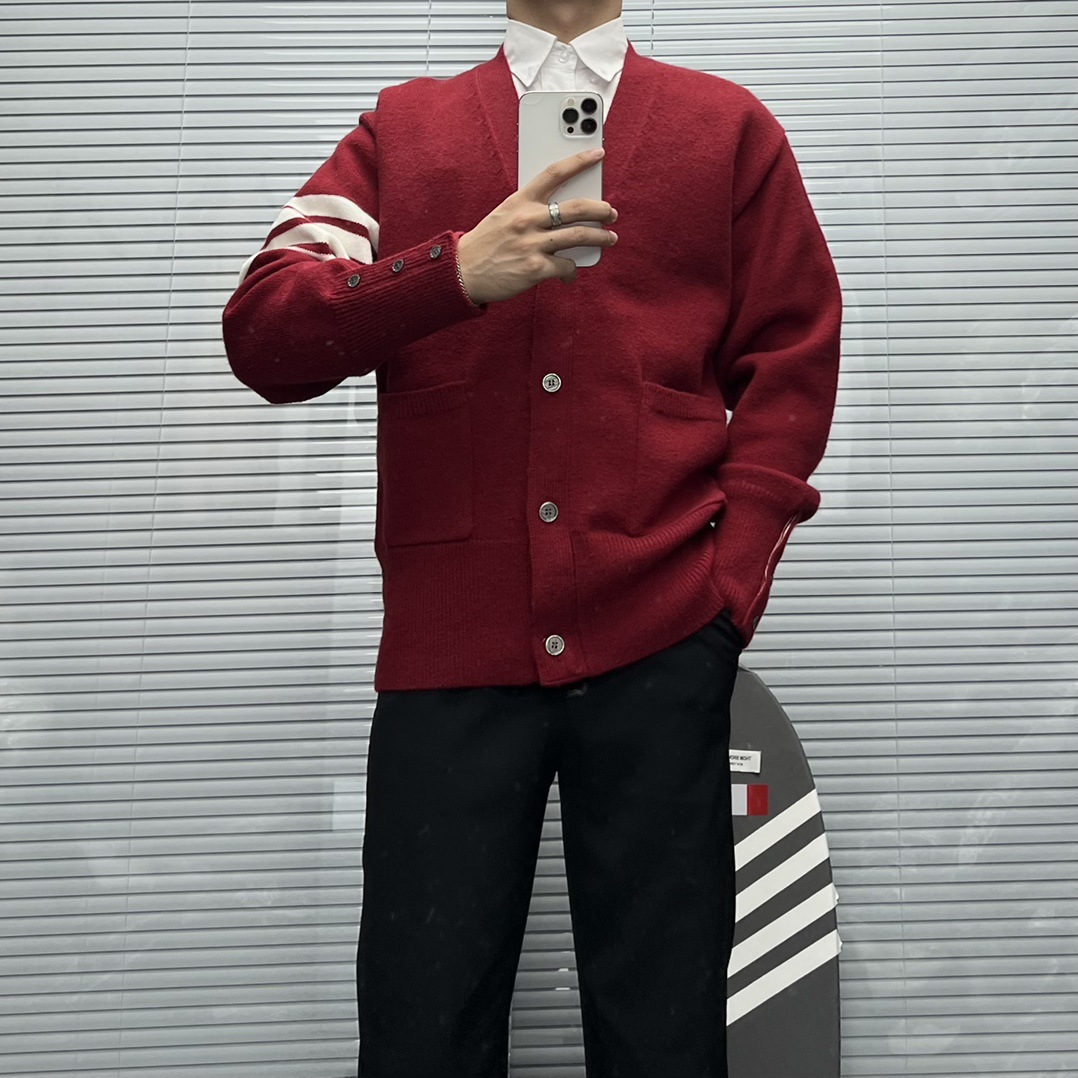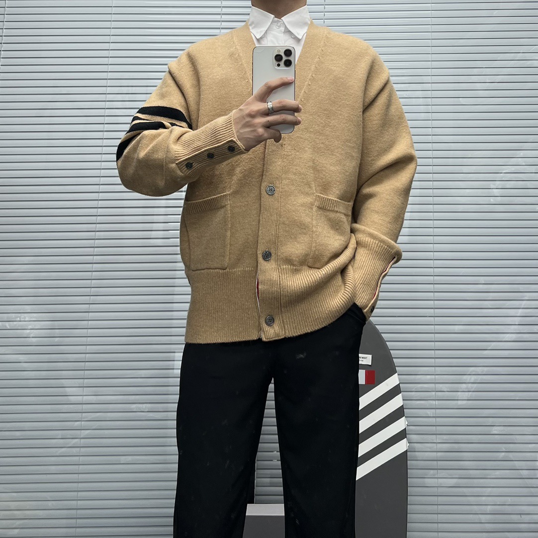 TB 신상 남성용 하이엔드 다용도 4바 스트라이프 니트 루즈 OS 버전 카디건 학습 브이넥 스웨터 재킷스토어 가기