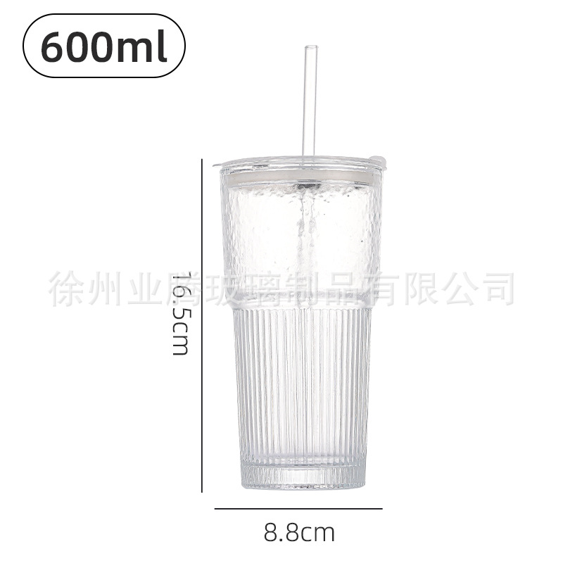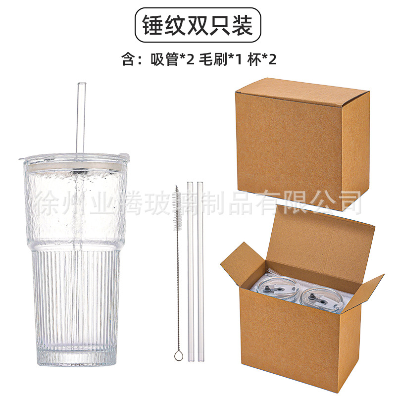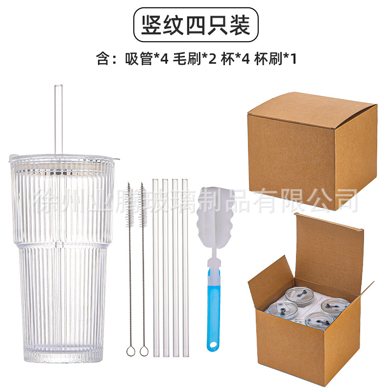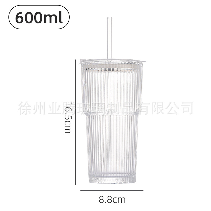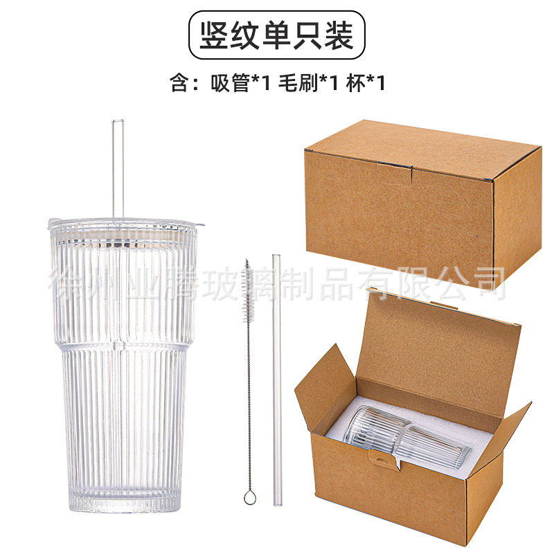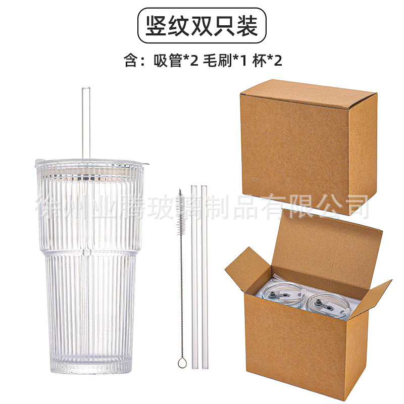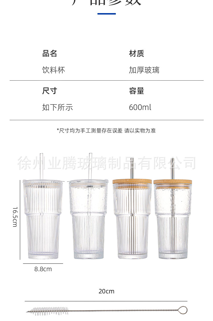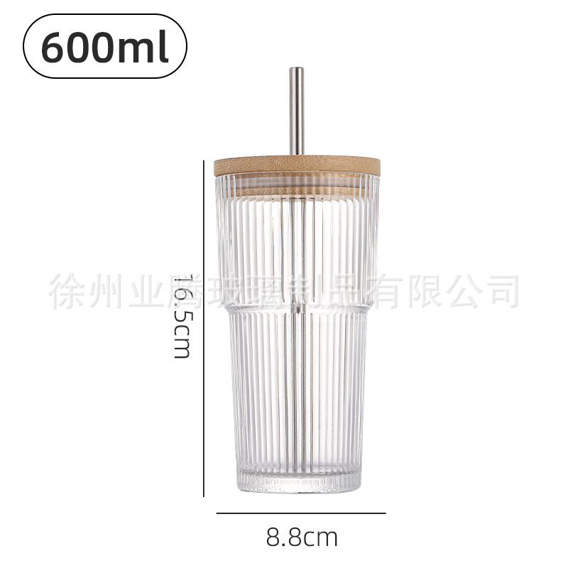 Amazon 20oz 대나무 유리 수직 패턴 컵 나무 뚜껑 음료 컵 600ml 광택 밀짚 차가운 음료 컵