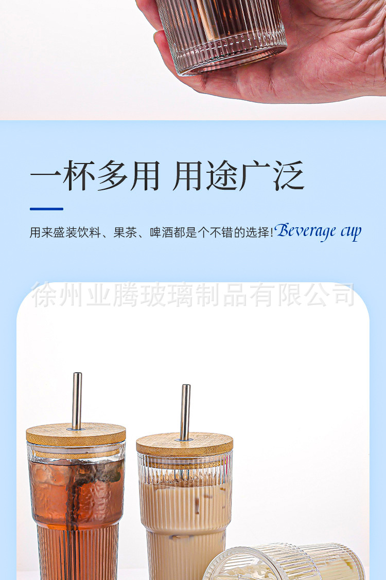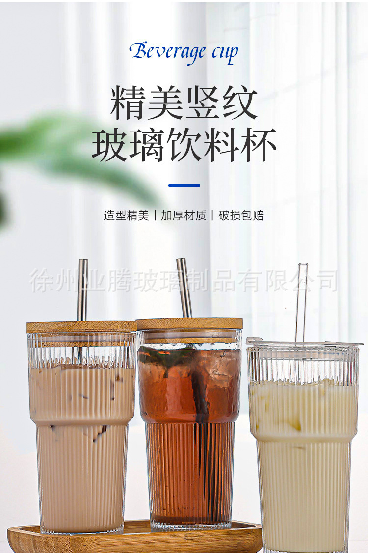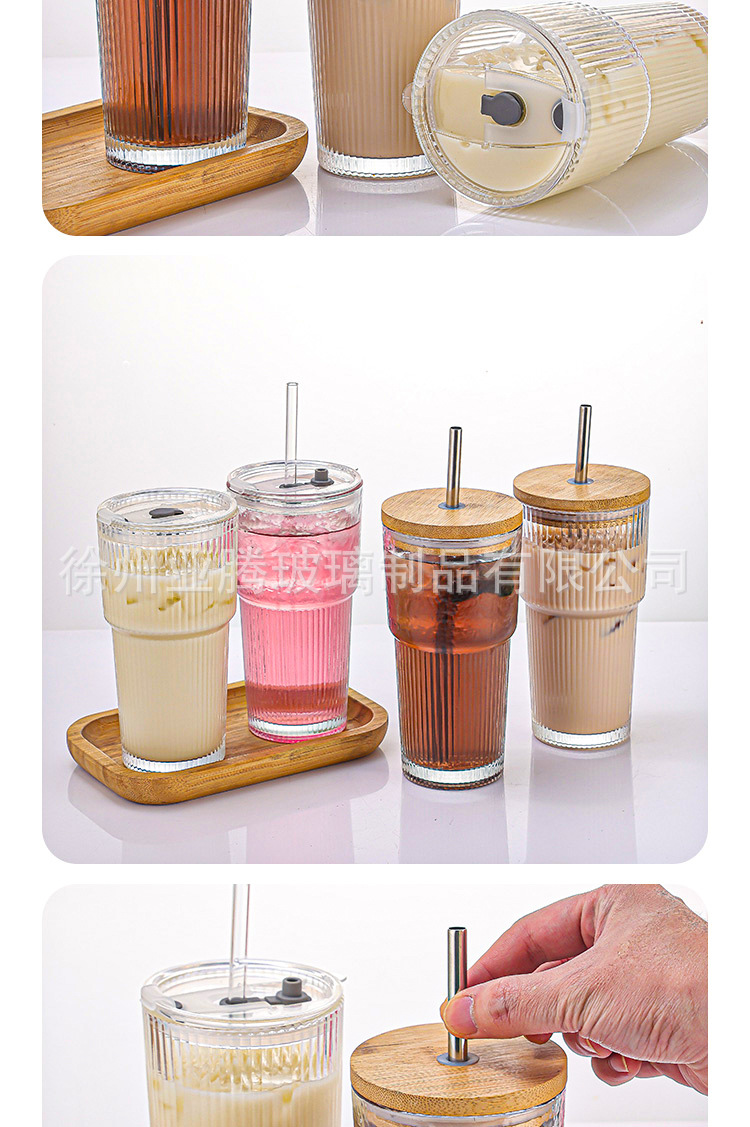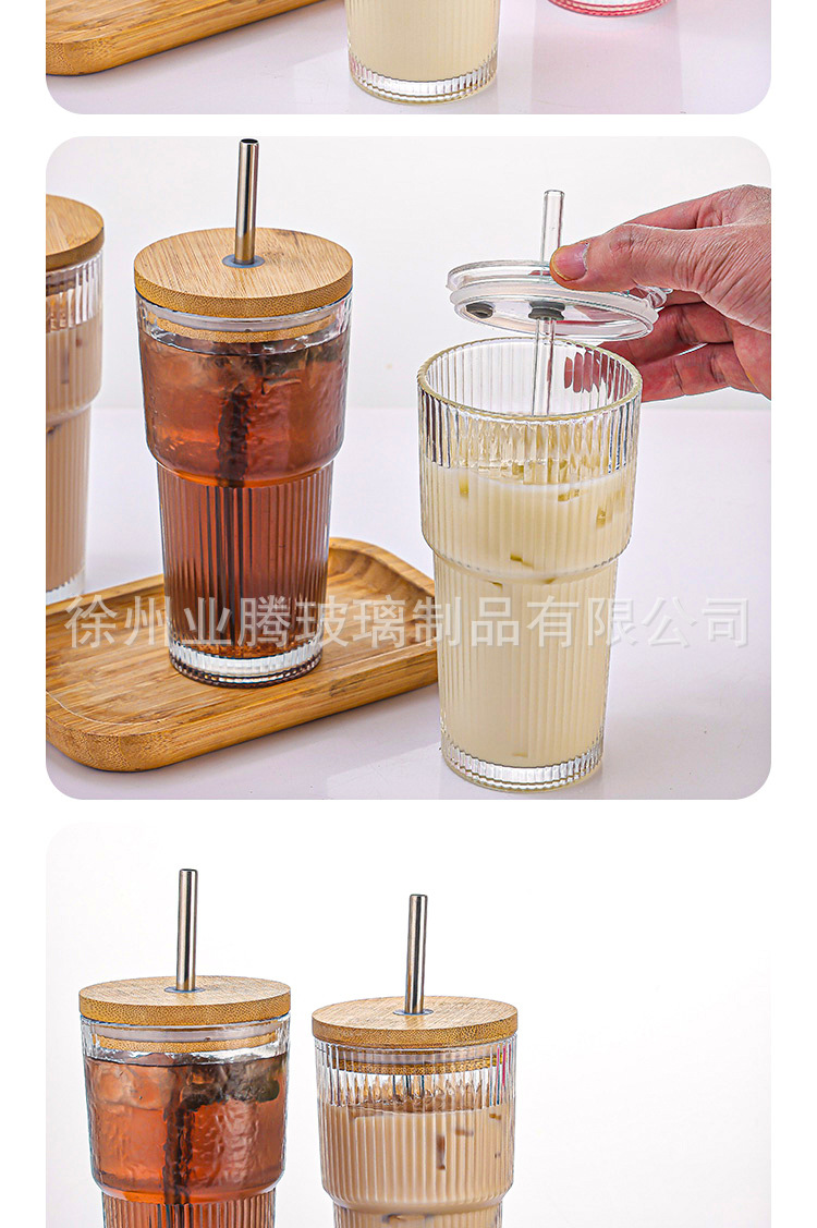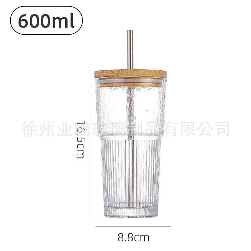 Amazon 20oz 대나무 유리 수직 패턴 컵 나무 뚜껑 음료 컵 600ml 광택 밀짚 차가운 음료 컵스토어 가기